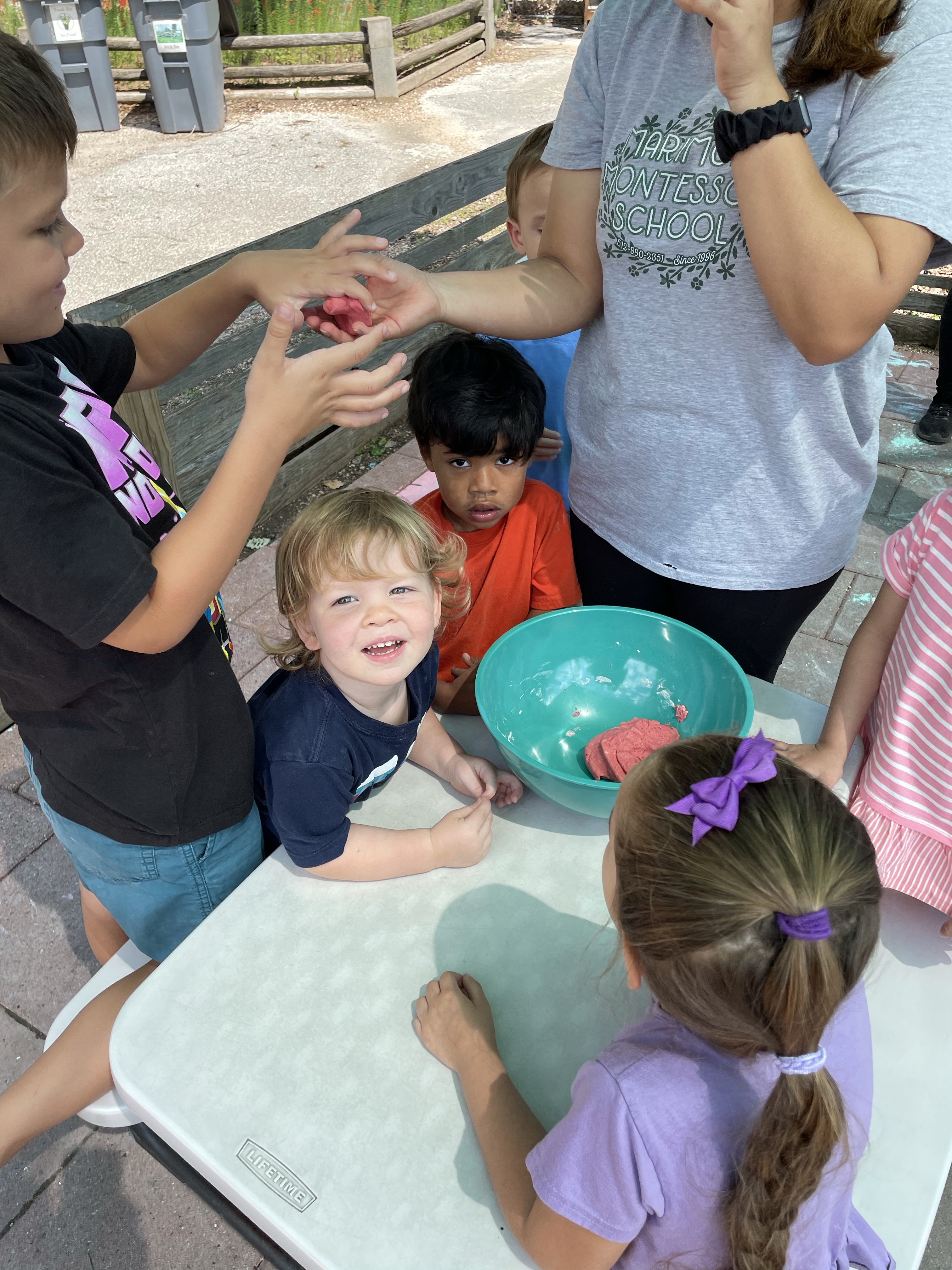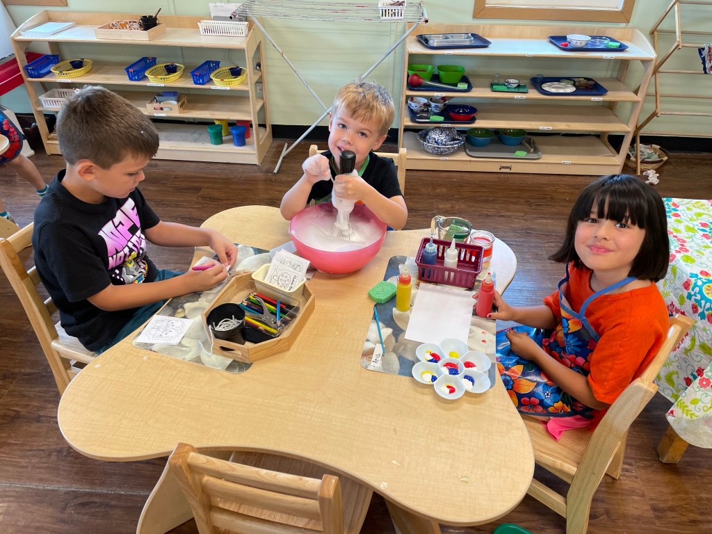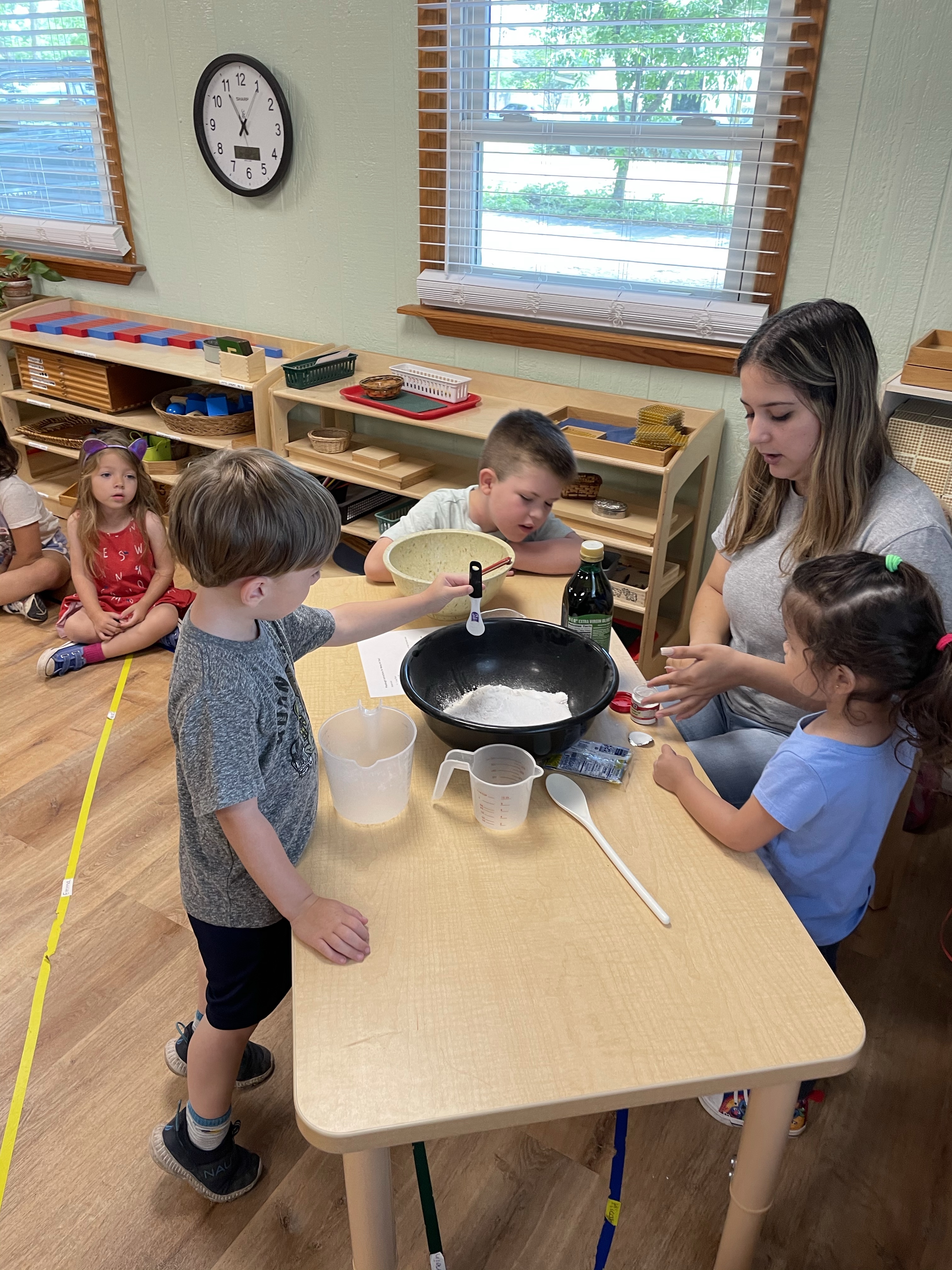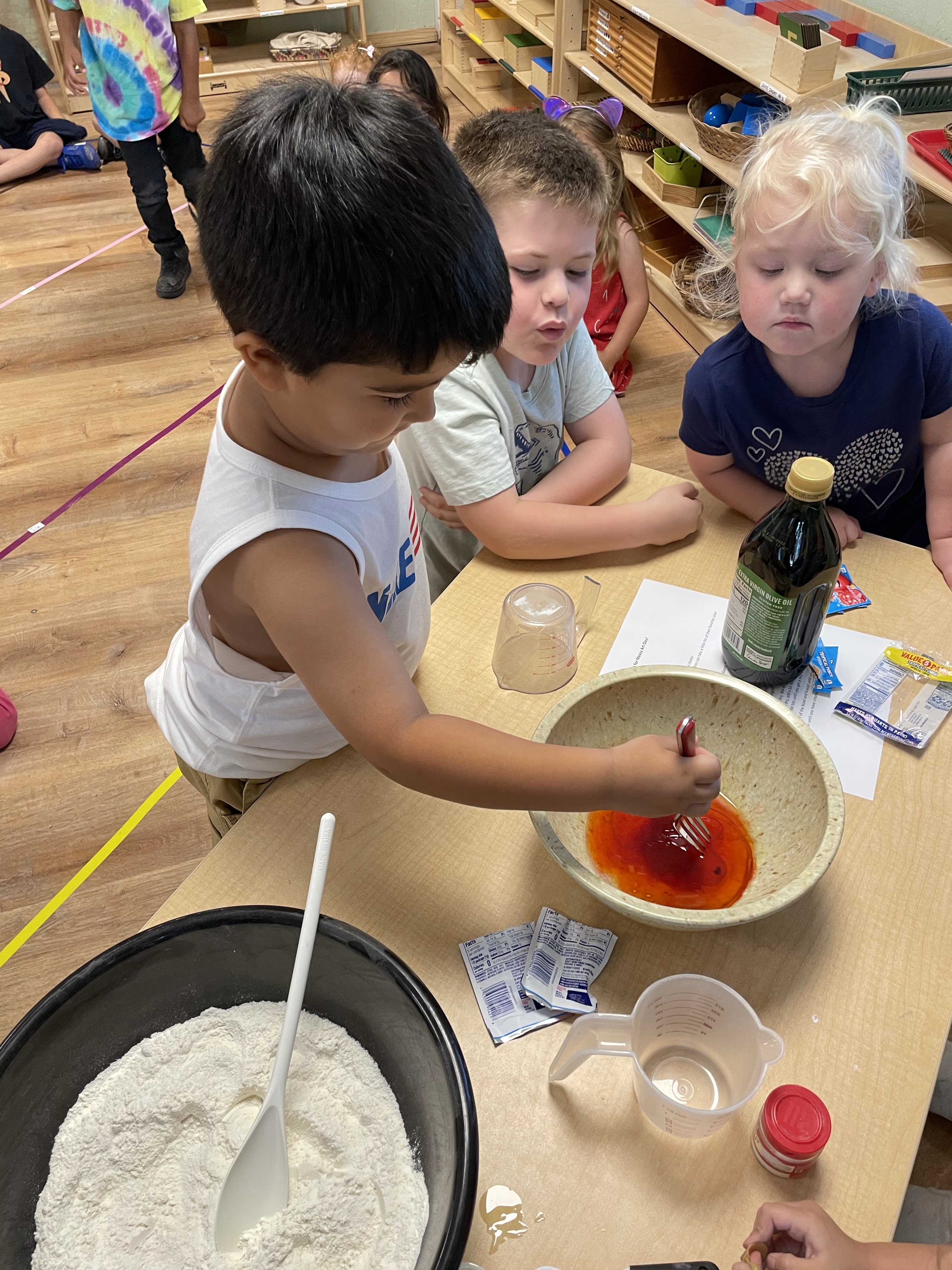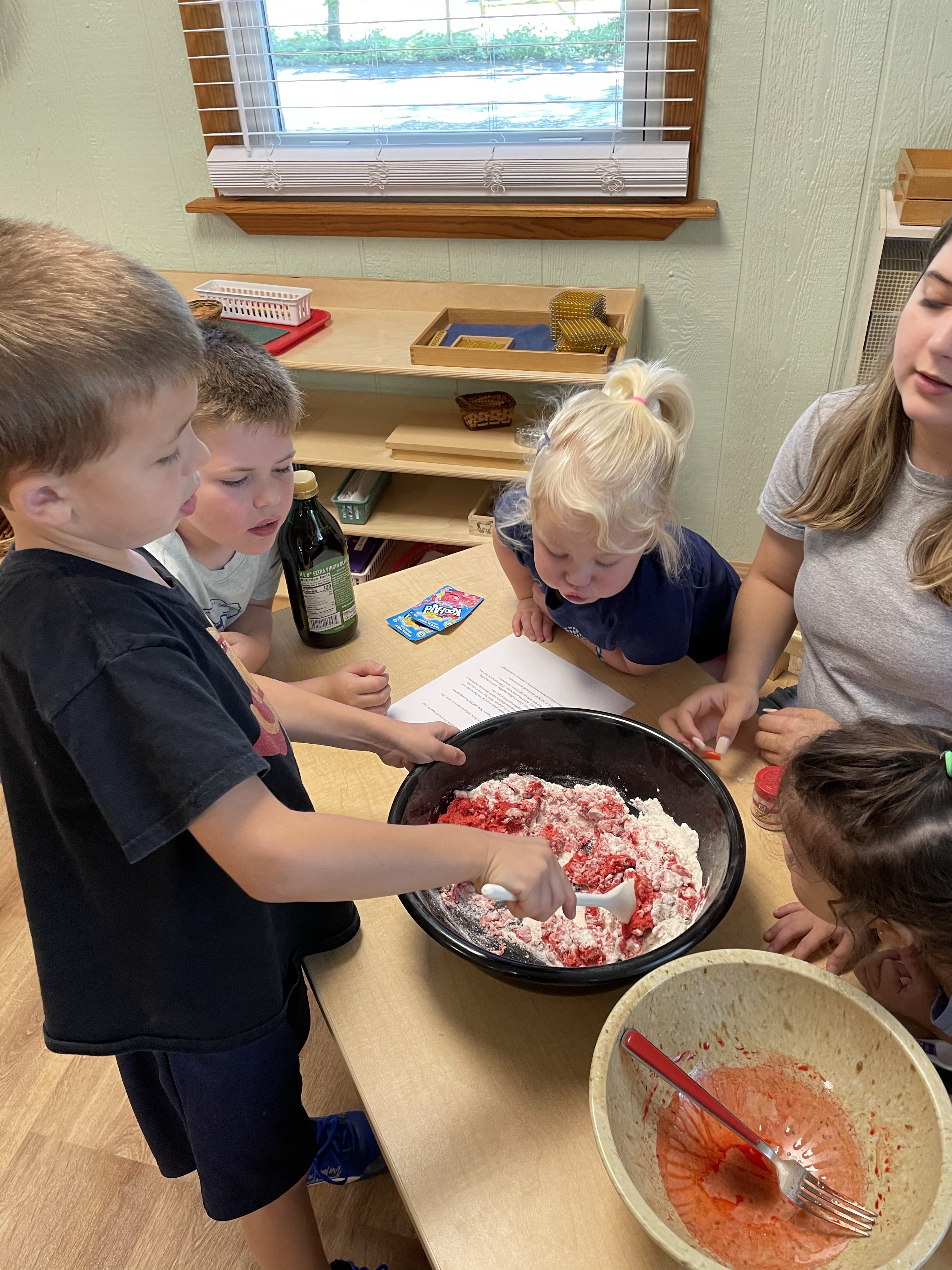 The children had a great time with the sensorial experience of mixing, touching, and smelling the Kool-aid playdough they made as a class today. Next week’s Art Day will be truly, absolutely messy when we paint with fly swatters–just a heads up 🙂