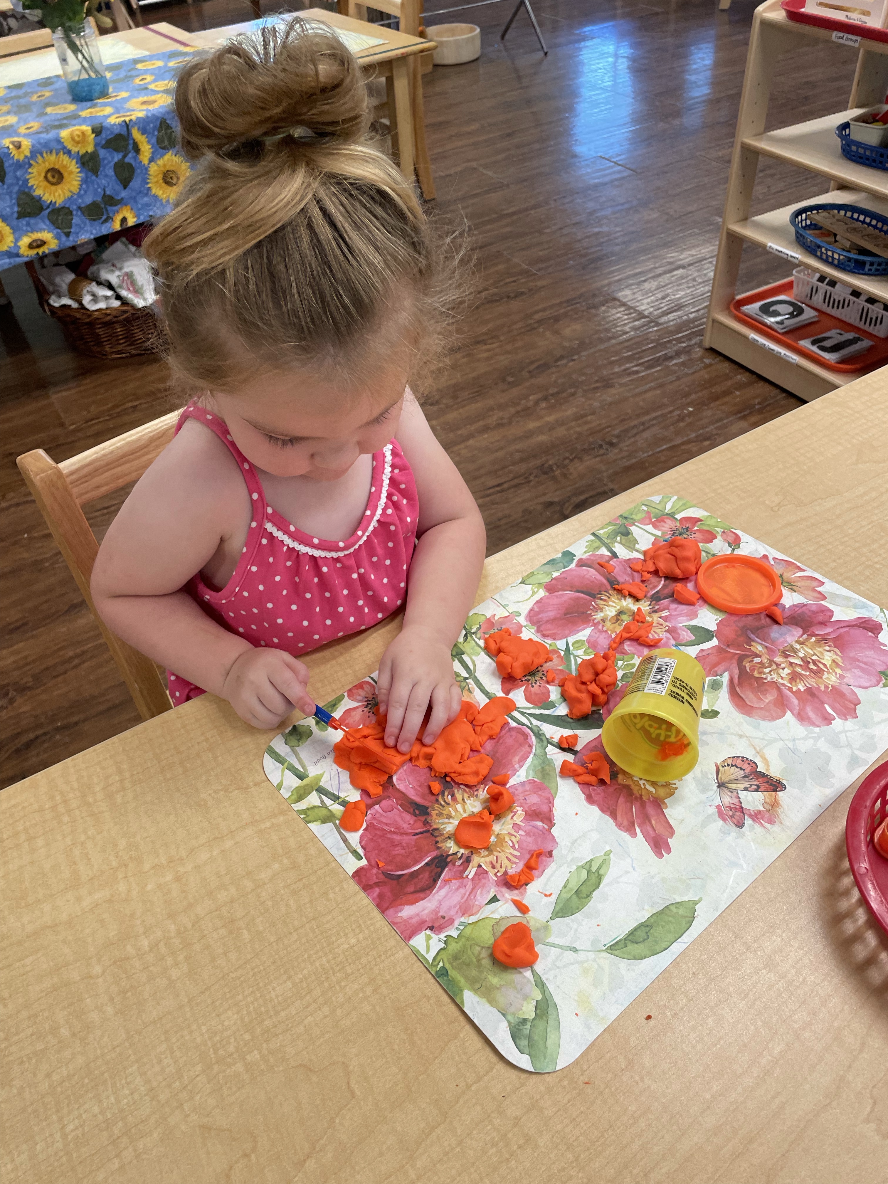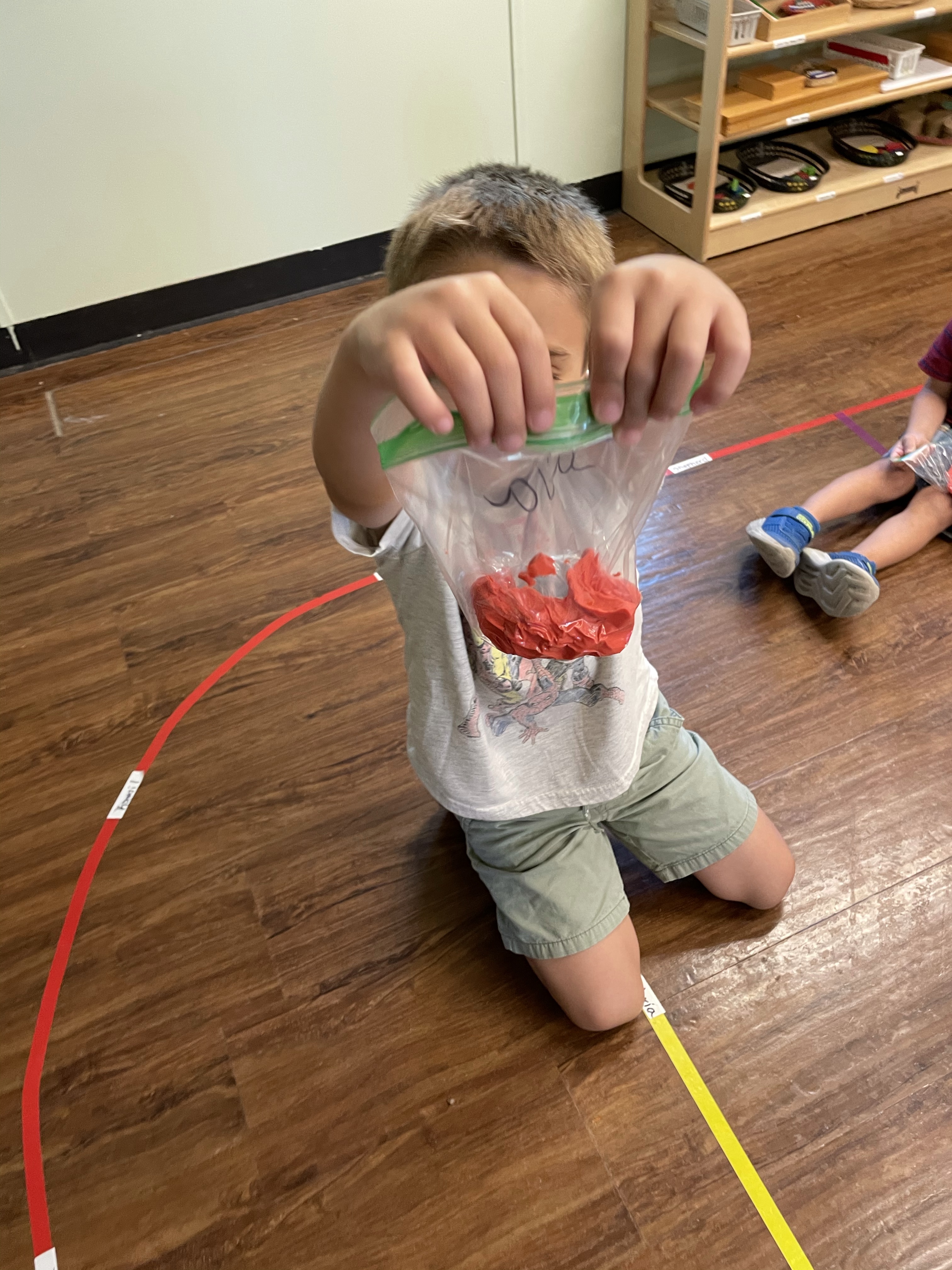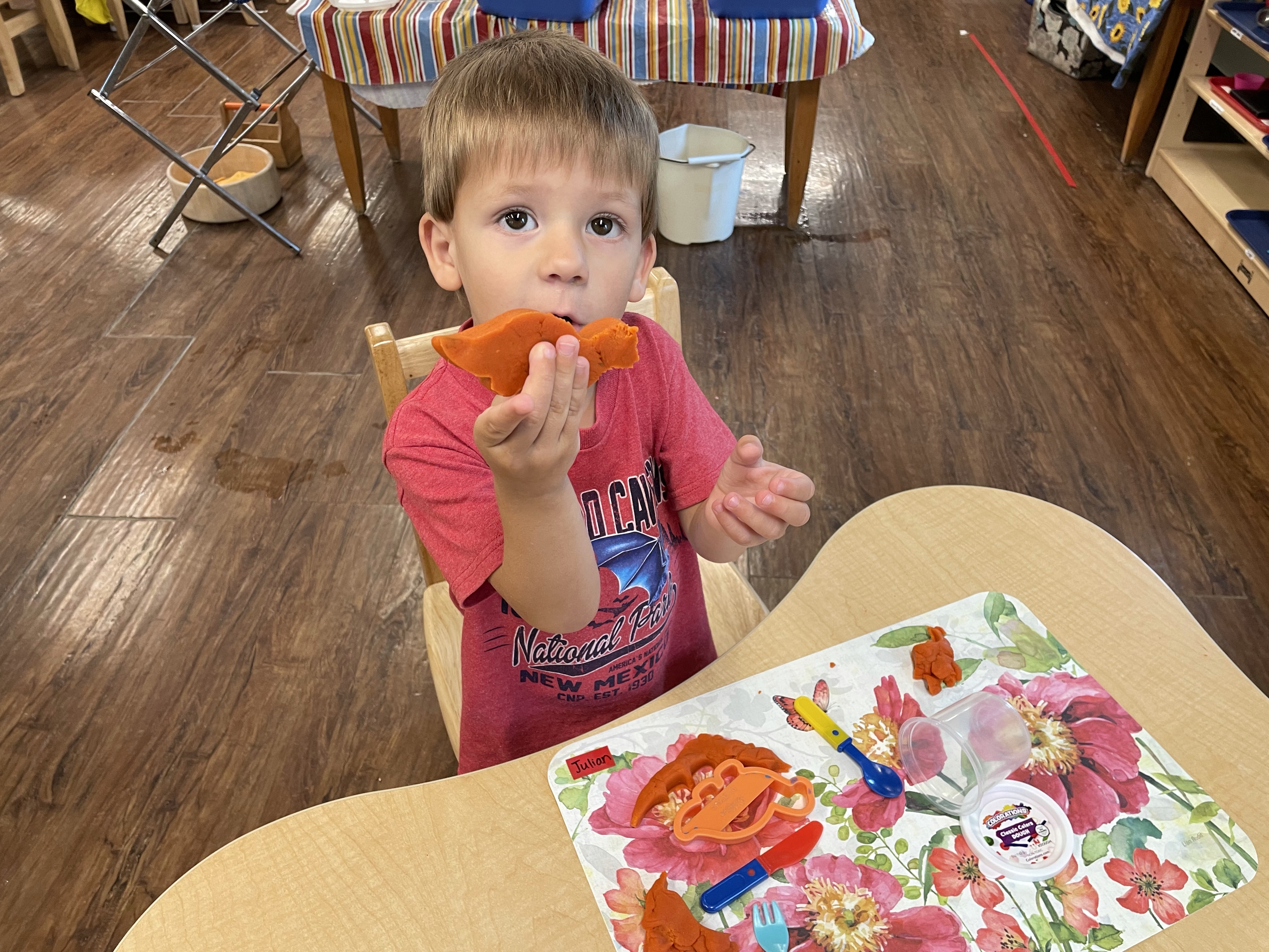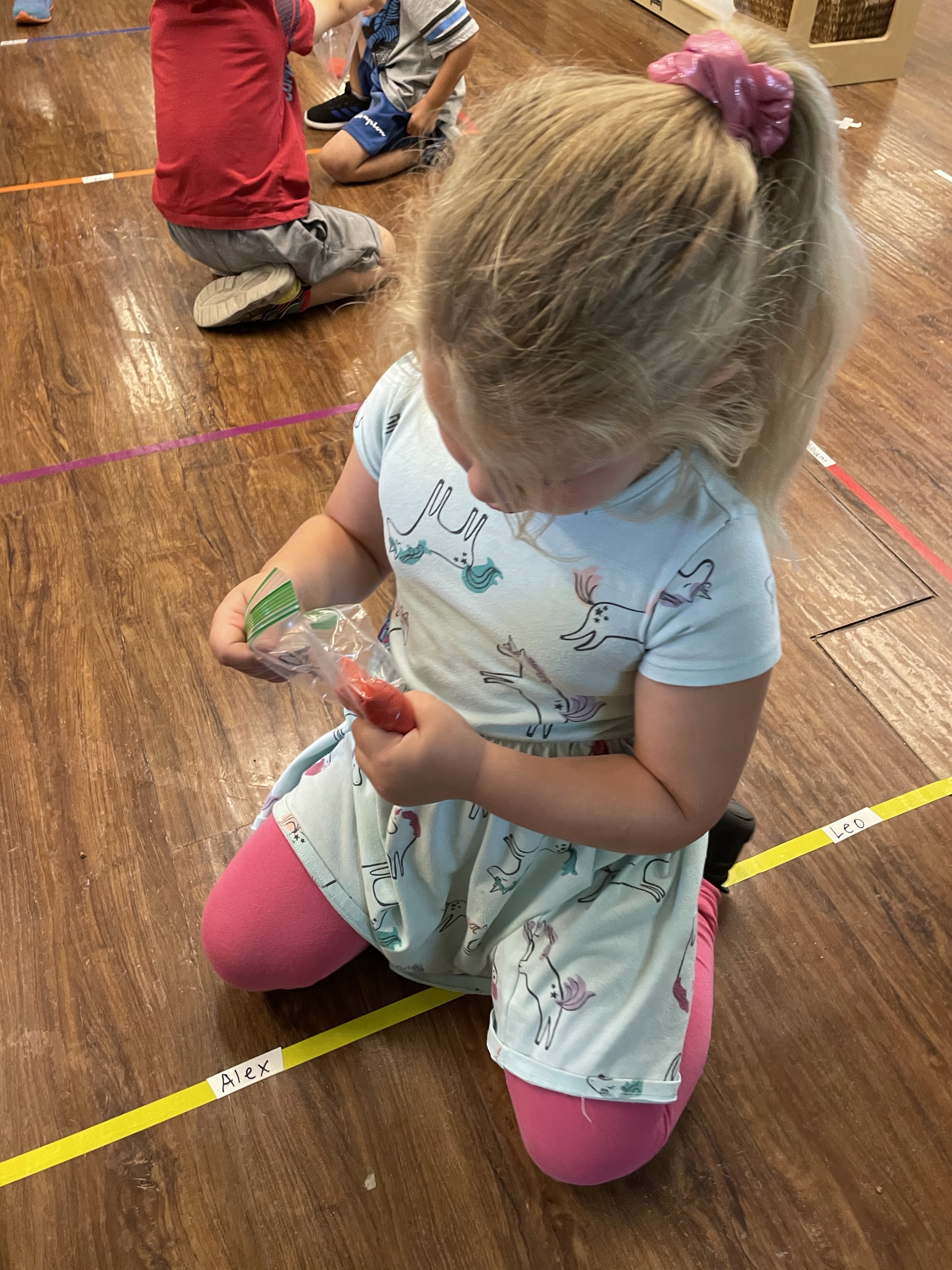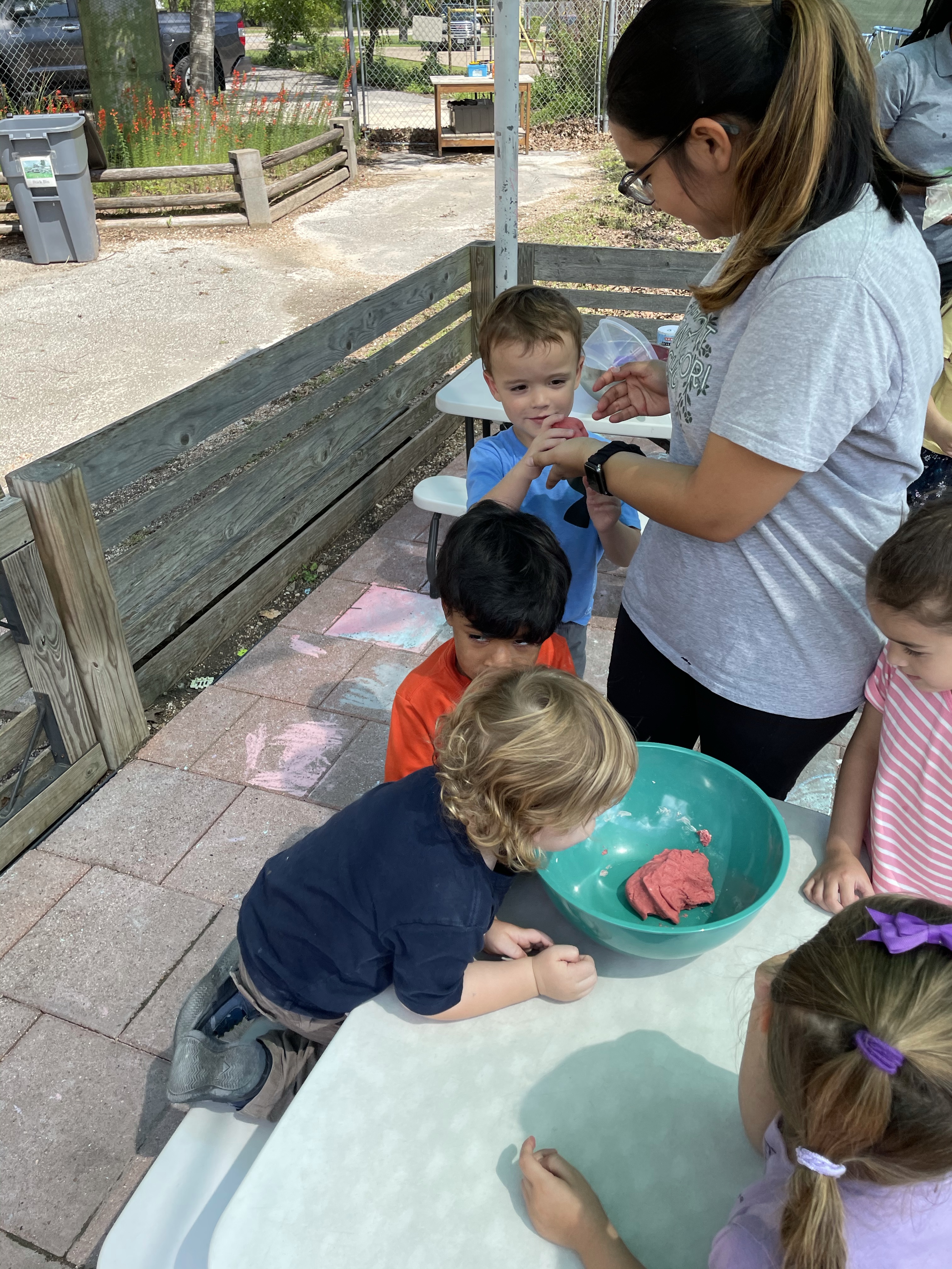 The children had a great time with the sensorial experience of mixing, touching, and smelling the Kool-aid playdough they made as a class today. Next week’s Art Day will be truly, absolutely messy when we paint with fly swatters–just a heads up 🙂