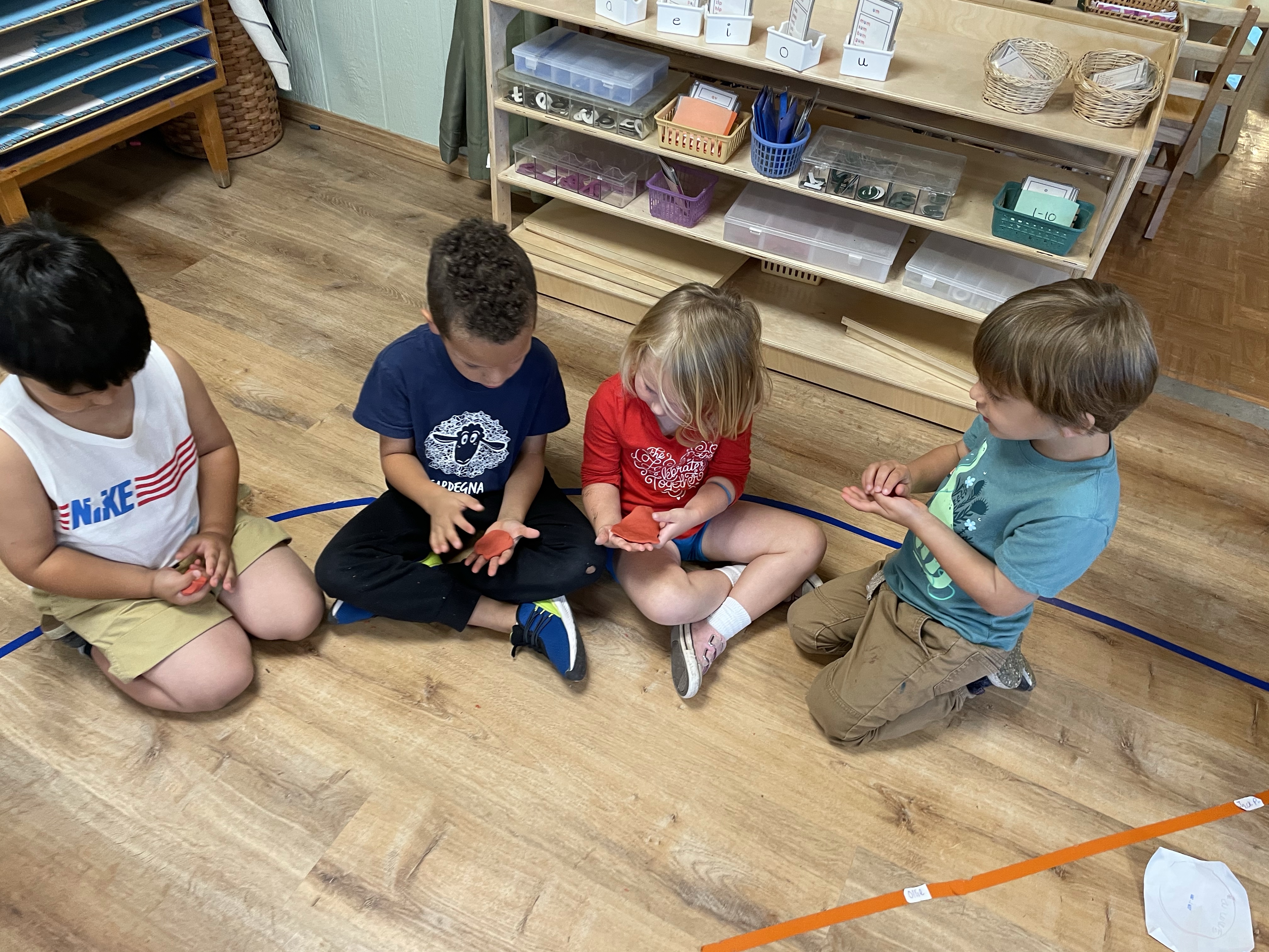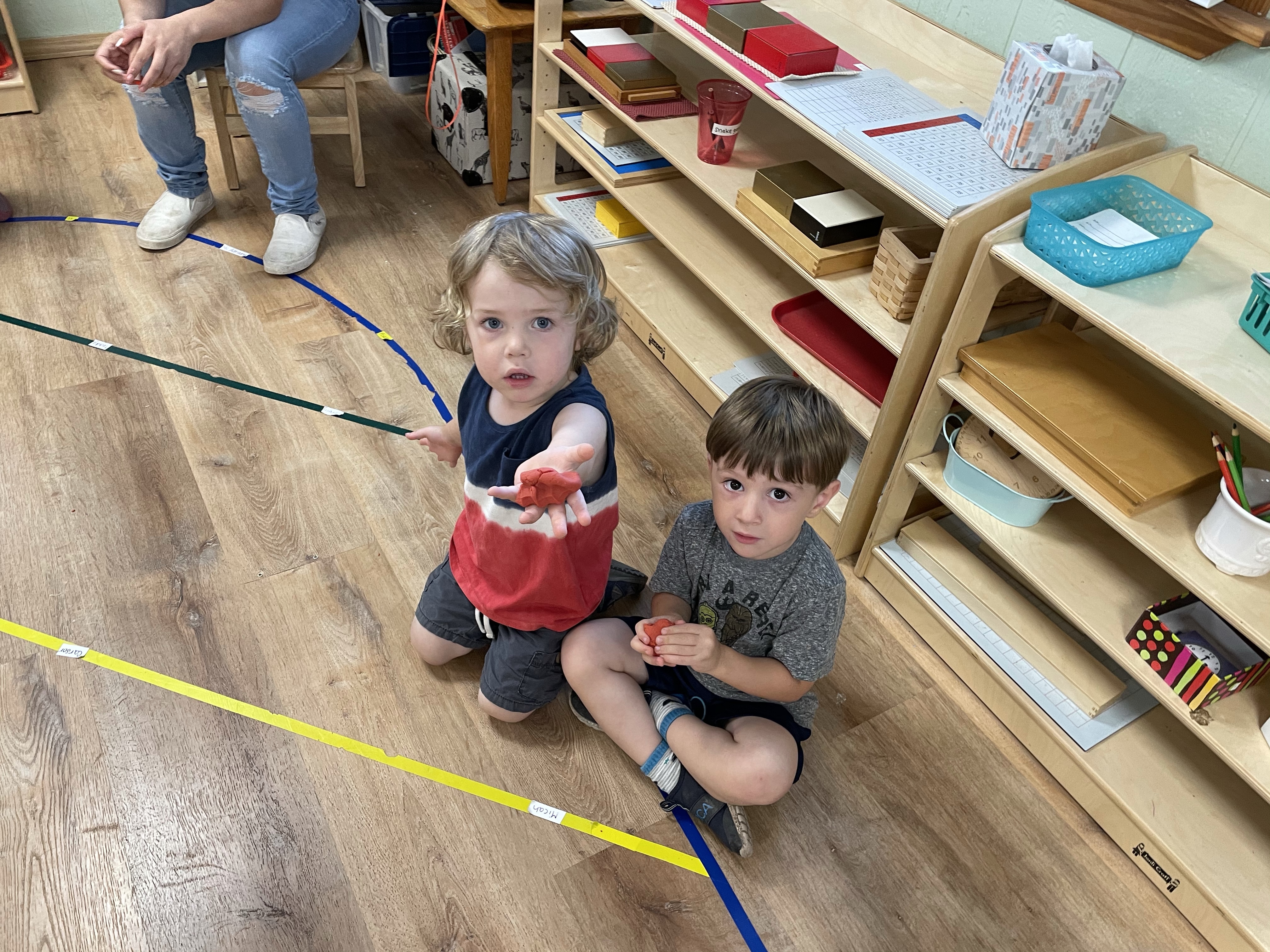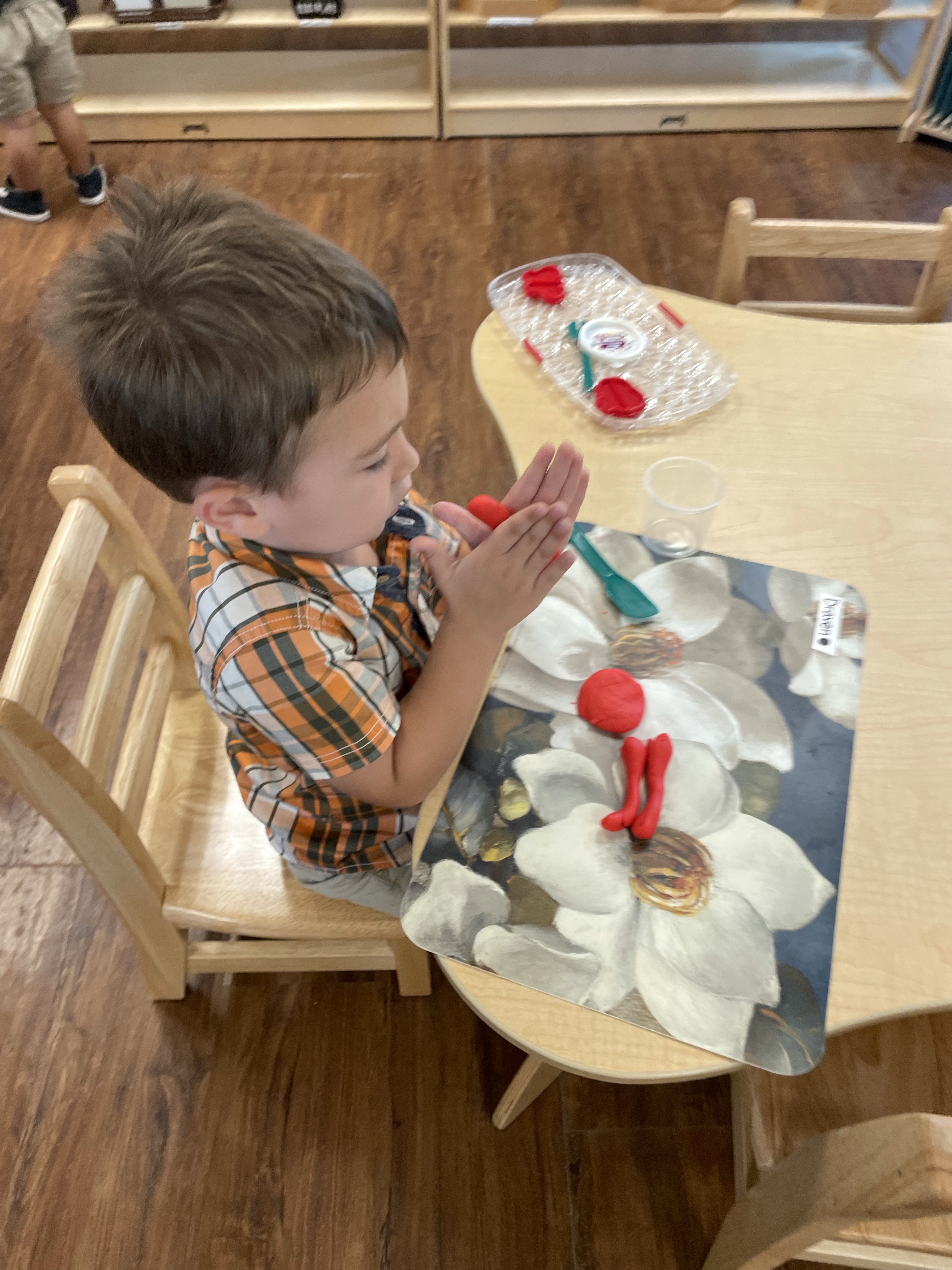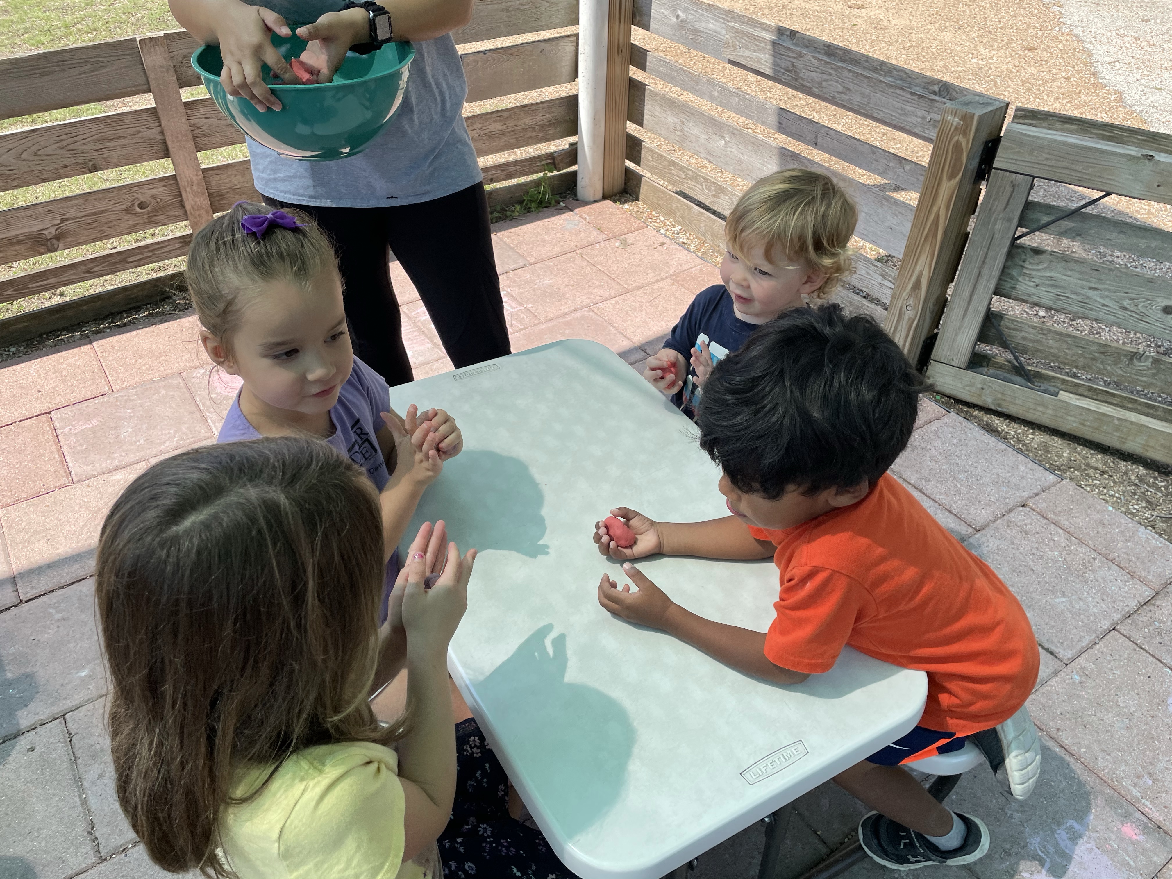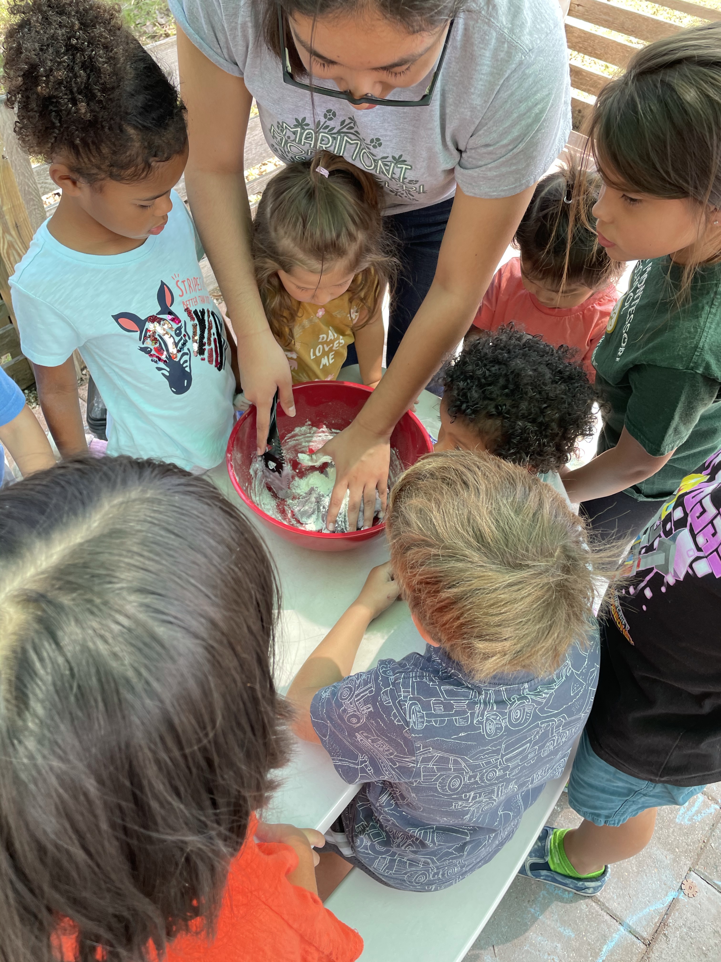 The children had a great time with the sensorial experience of mixing, touching, and smelling the Kool-aid playdough they made as a class today. Next week’s Art Day will be truly, absolutely messy when we paint with fly swatters–just a heads up 🙂