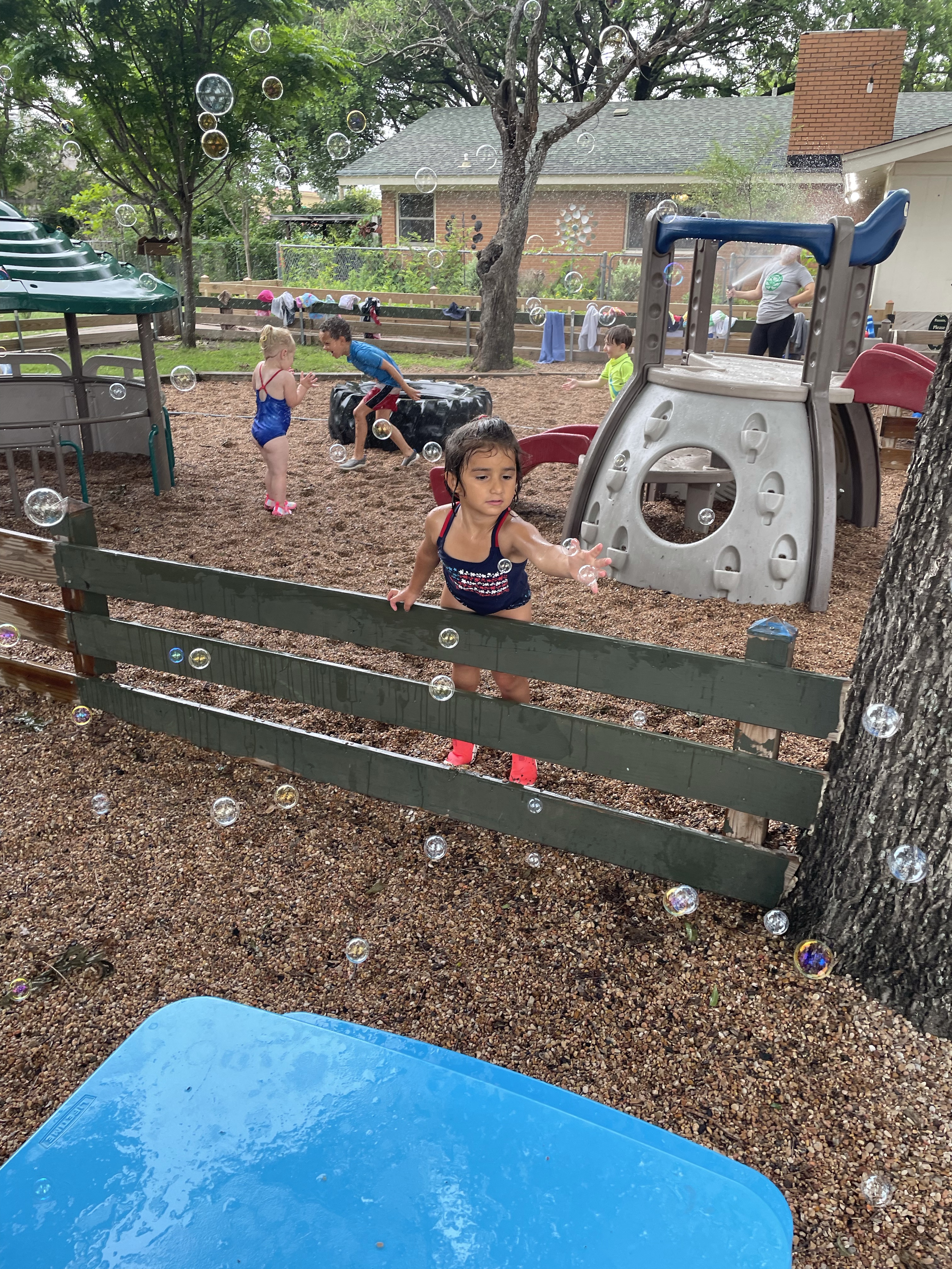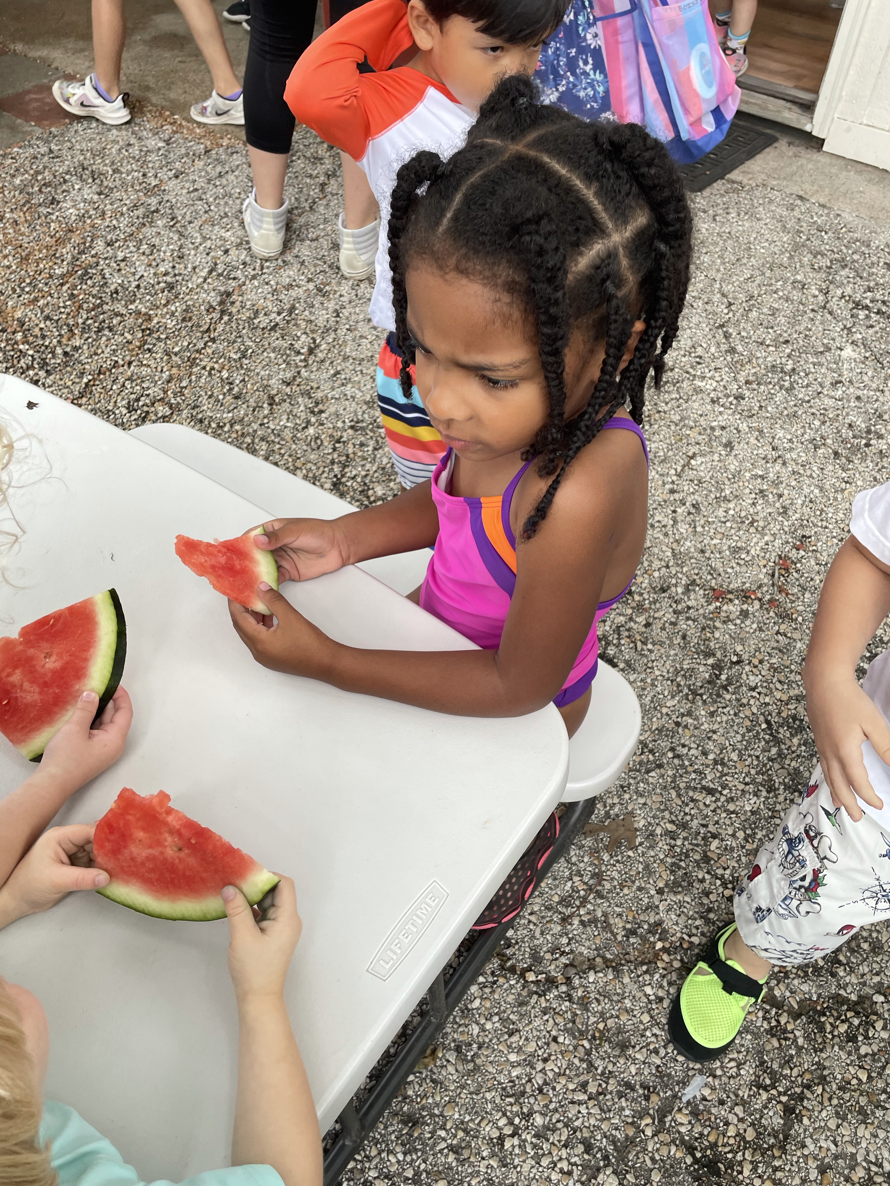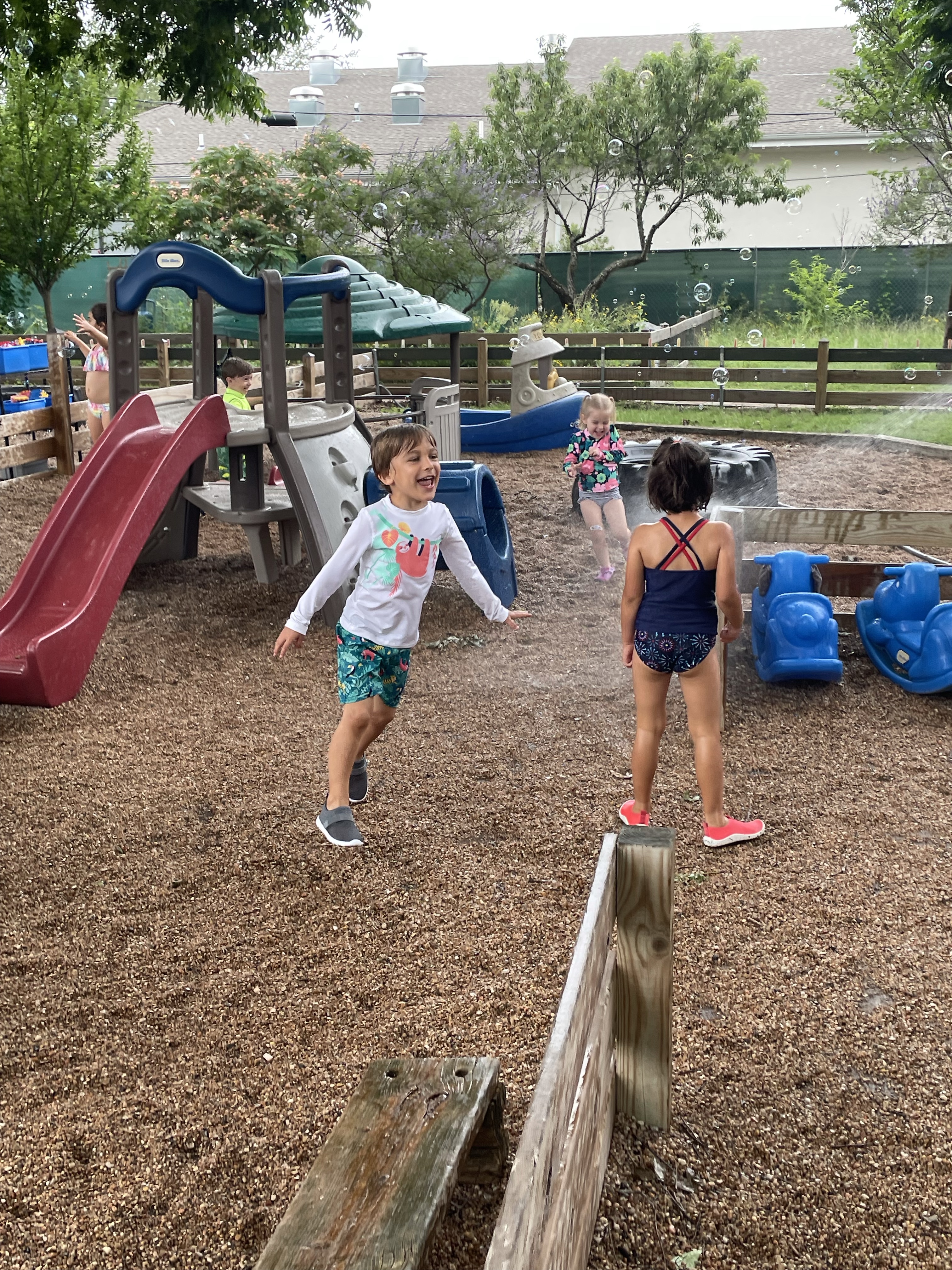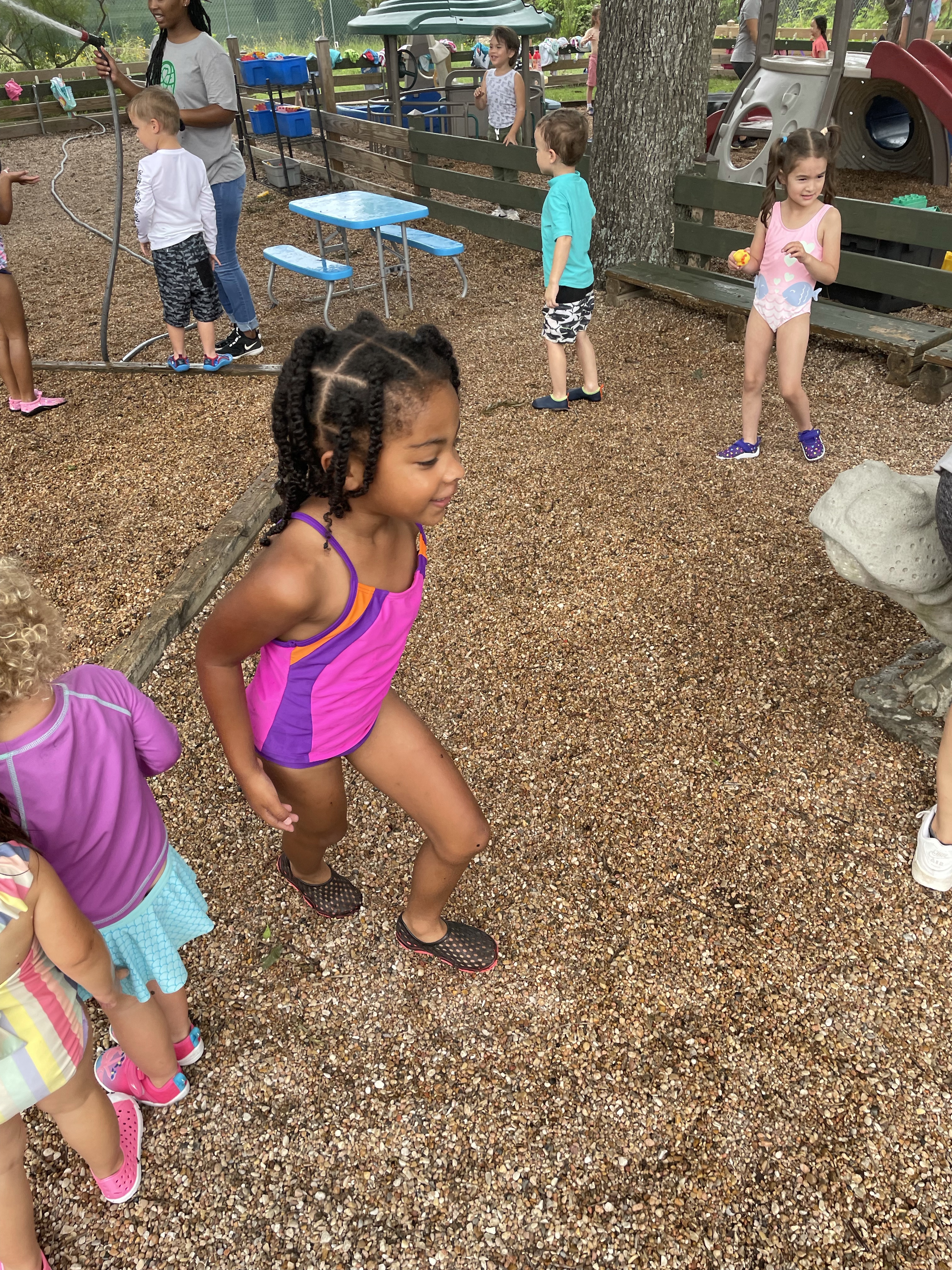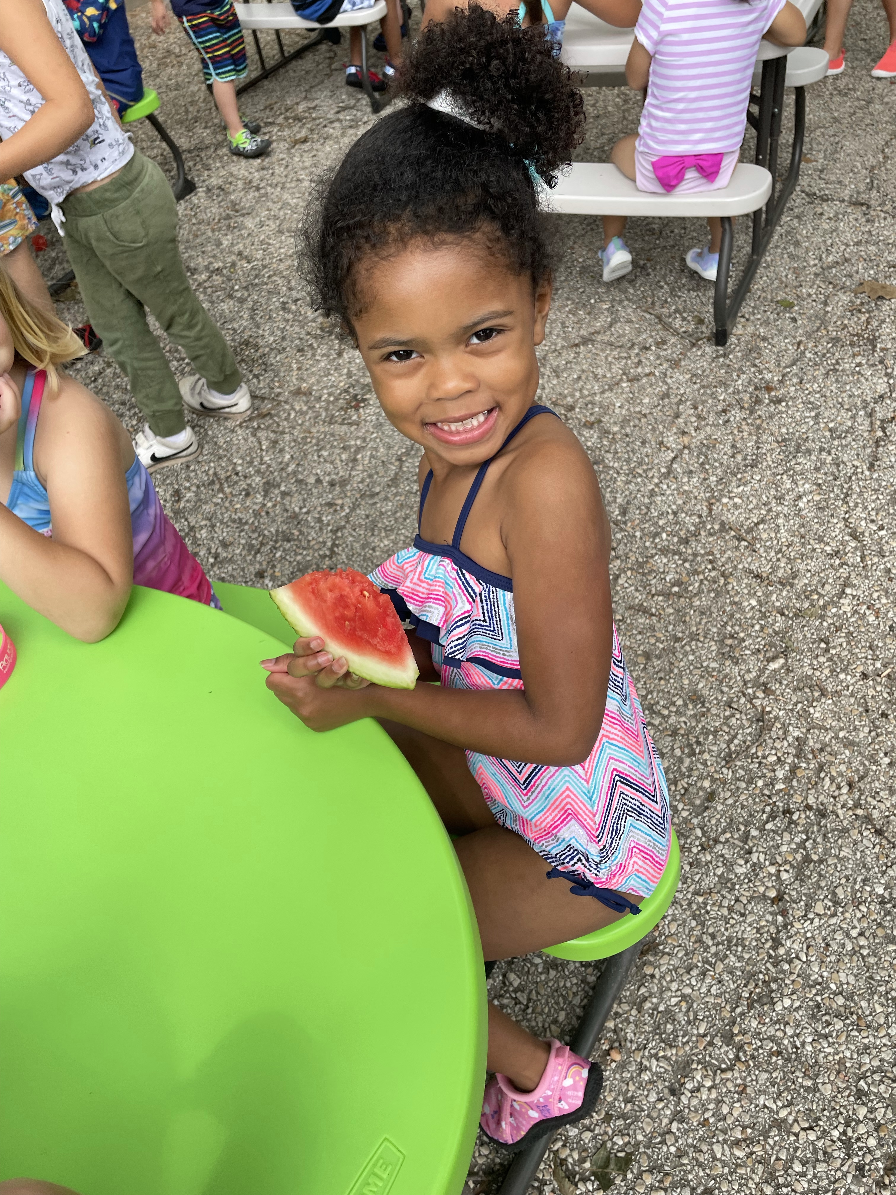 Yay! Your child can come to school in their bathing suits/with shirts or rash guards and wearing their normal sneakers. They should bring a bag with water shoes, a towel, and a change of clothing inside. We’ll help them change their shoes before splash day! After watermelon, bubbles, and fun on the playground with the hose, we will into our regular clothing and sneakers.