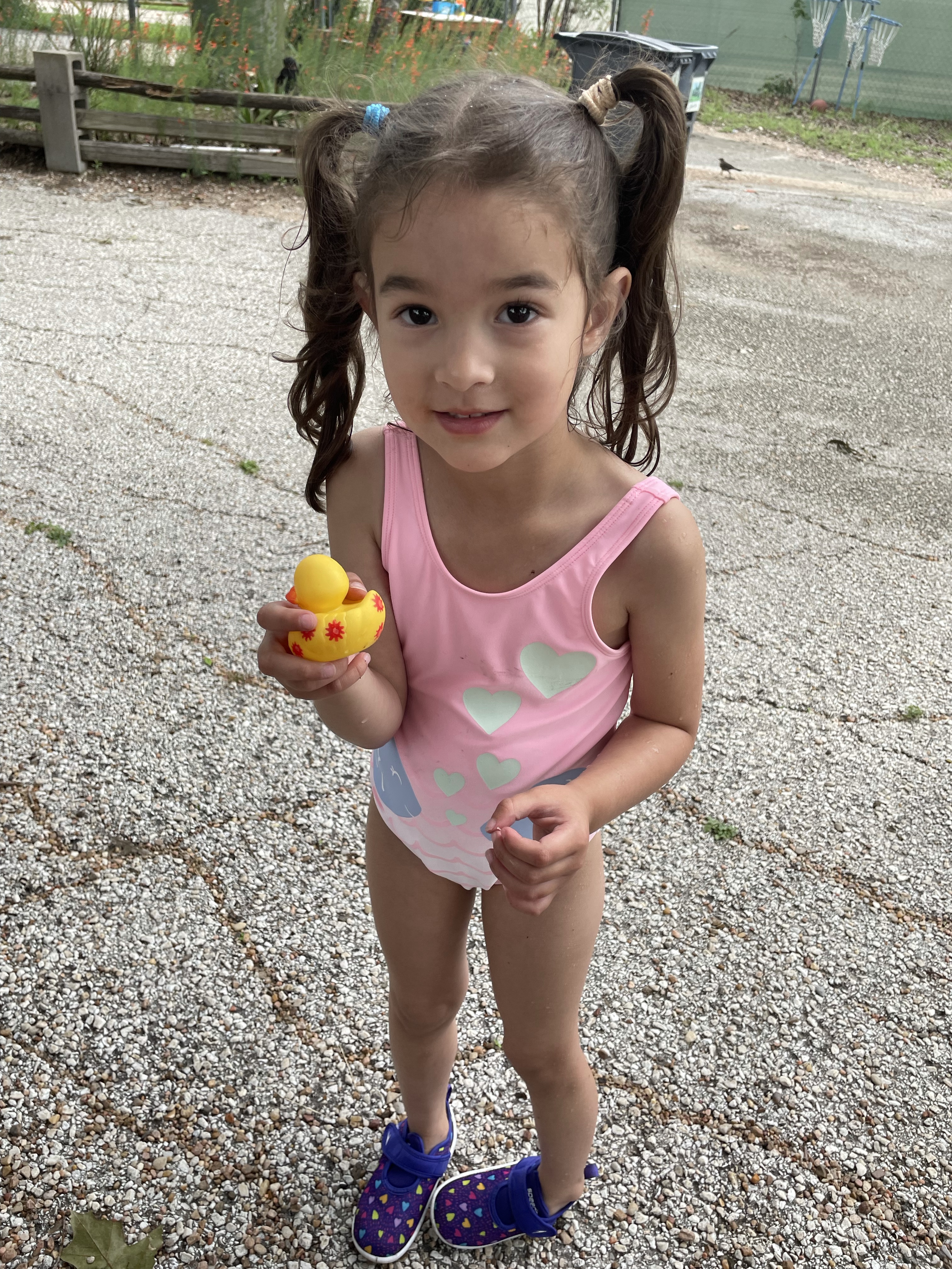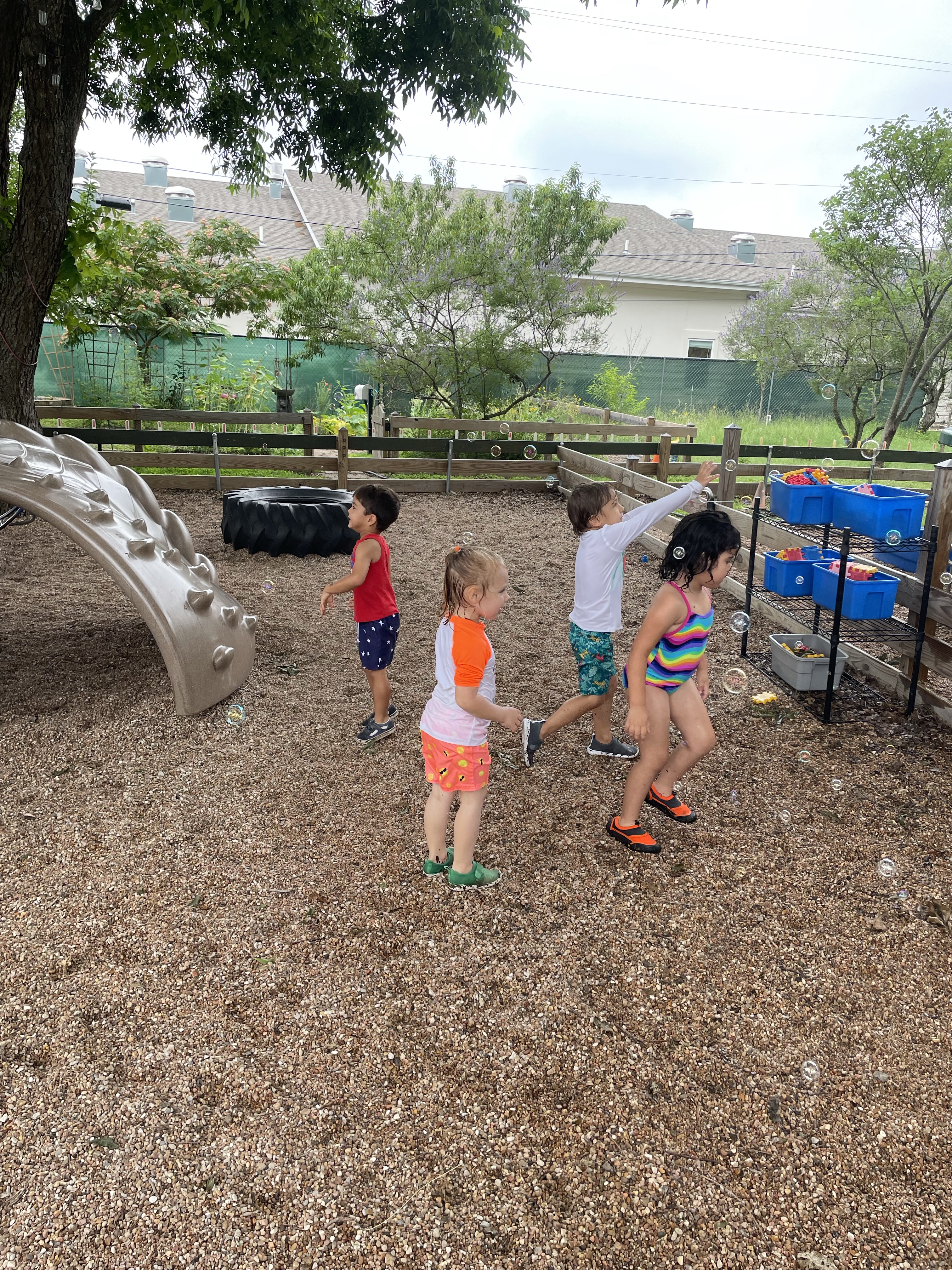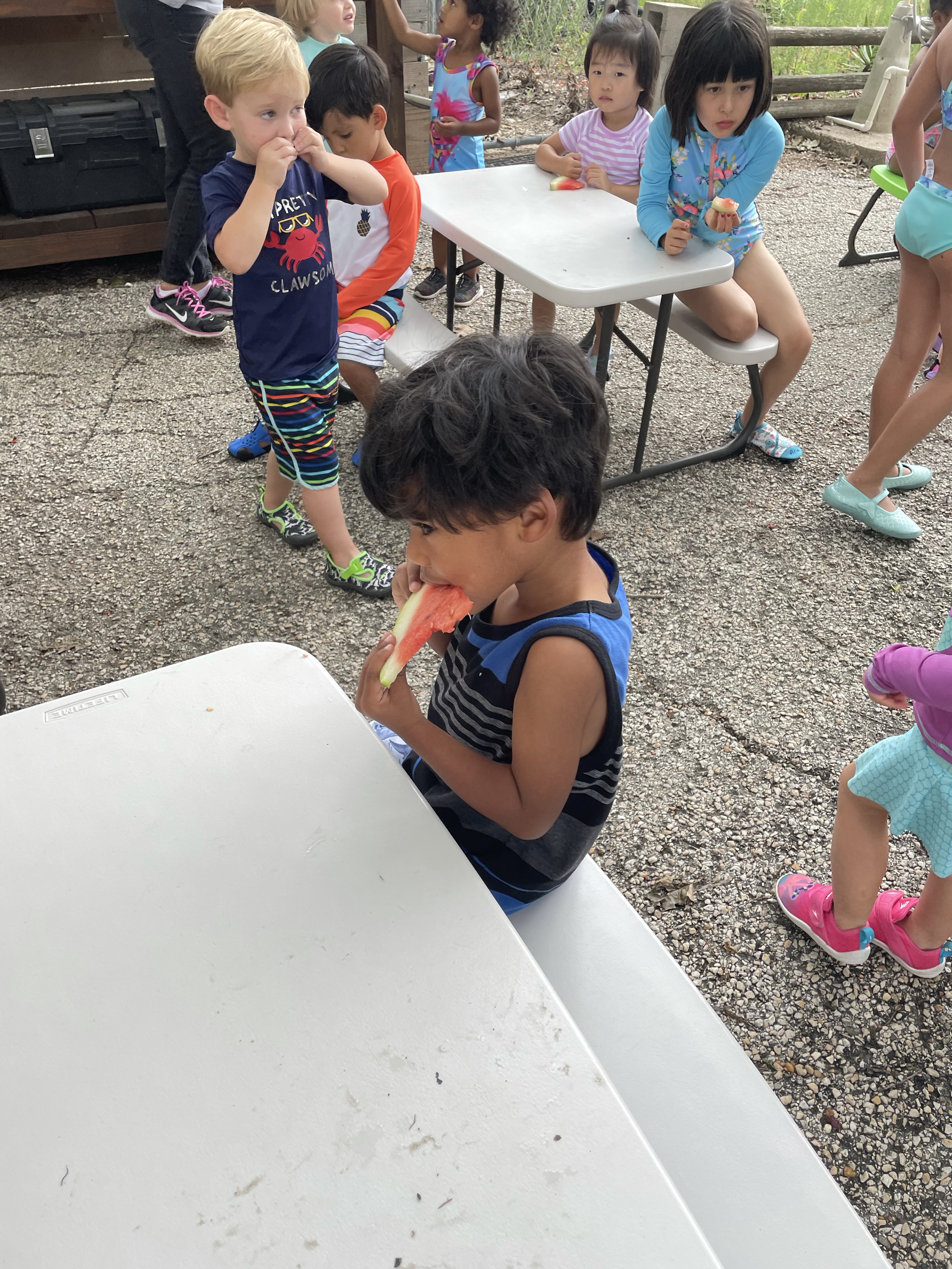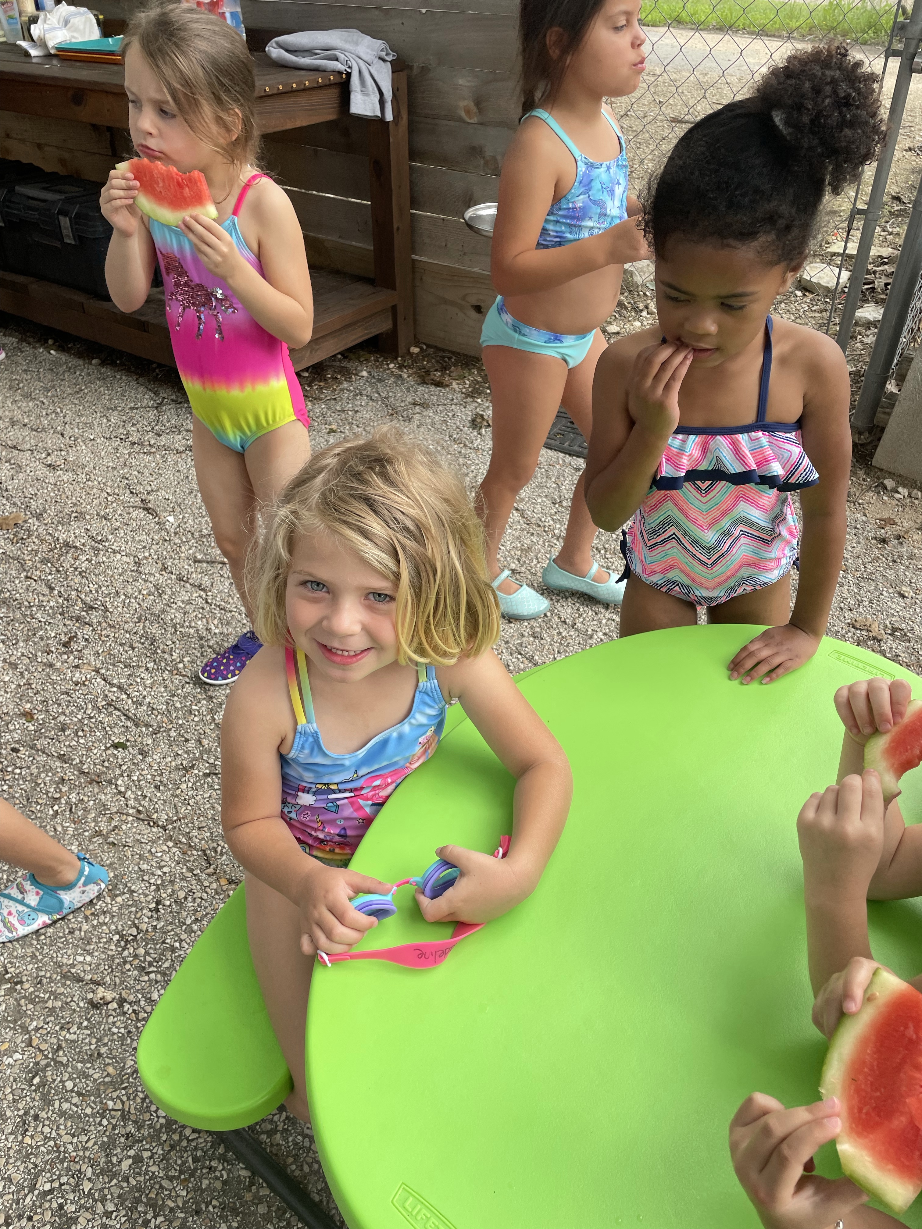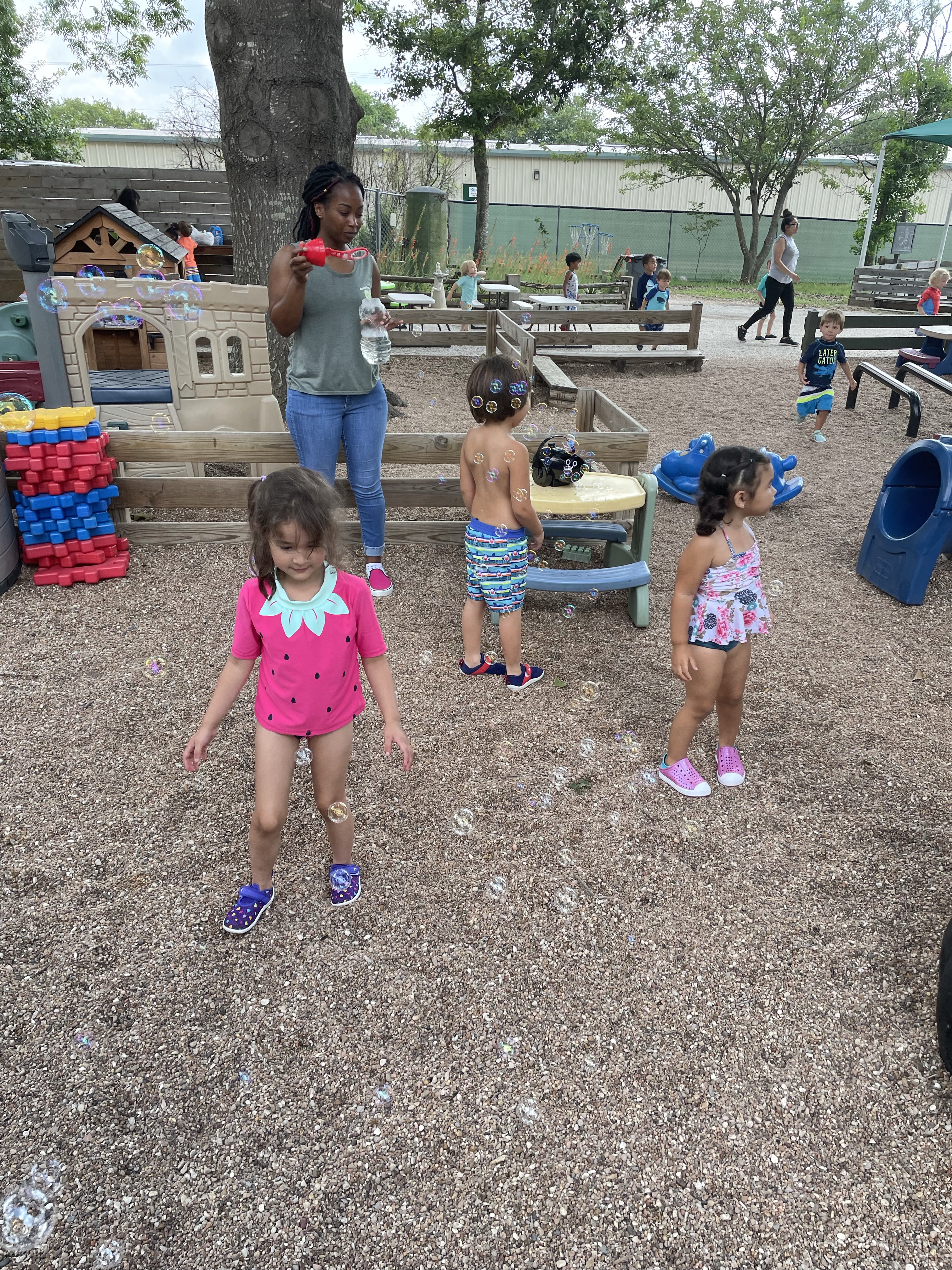 Yay! Your child can come to school in their bathing suits/with shirts or rash guards and wearing their normal sneakers. They should bring a bag with water shoes, a towel, and a change of clothing inside. We’ll help them change their shoes before splash day! After watermelon, bubbles, and fun on the playground with the hose, we will into our regular clothing and sneakers.