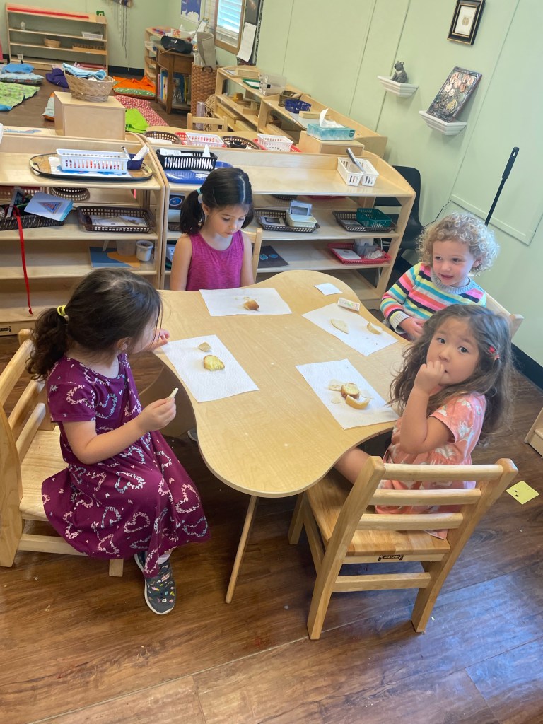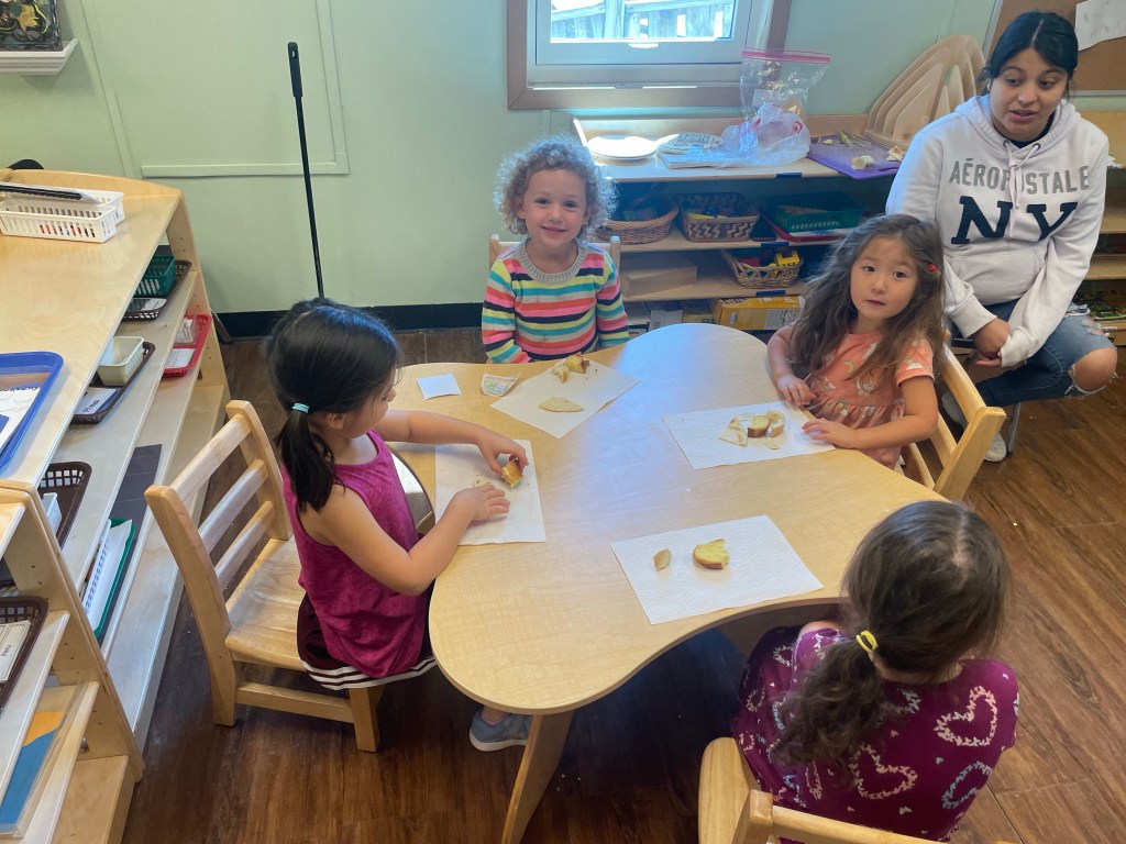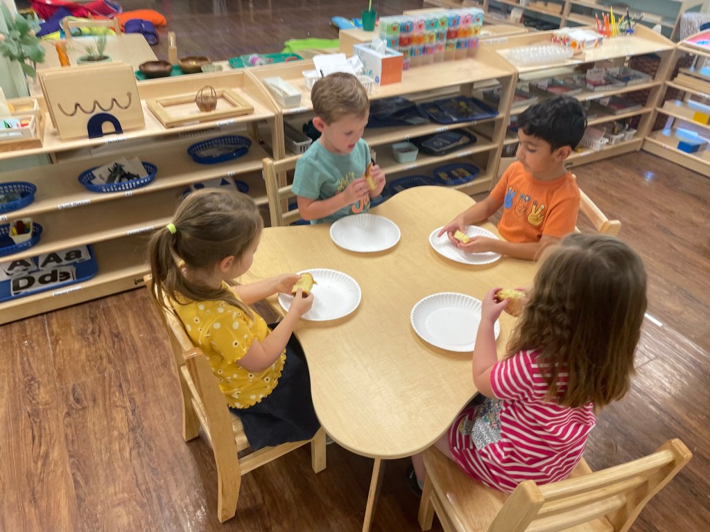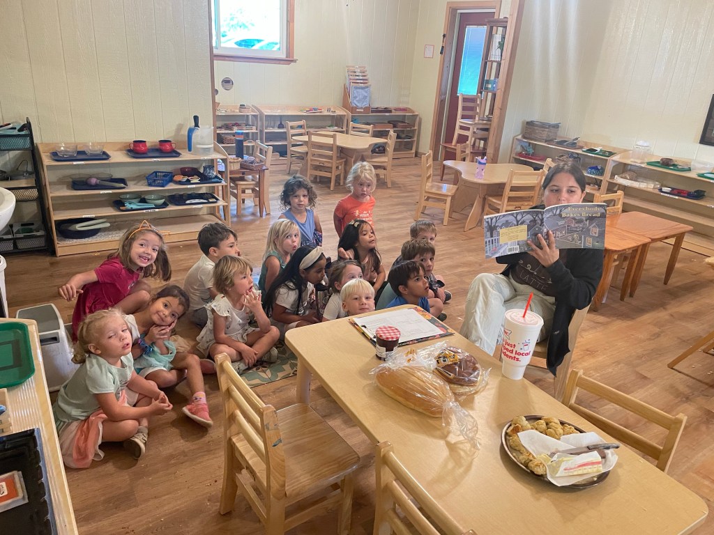 The older friends read the book Everybody bakes bread and practiced mindfully tasting some of the breads from different cultures listed in that book.
