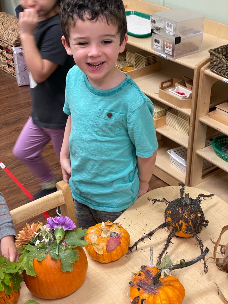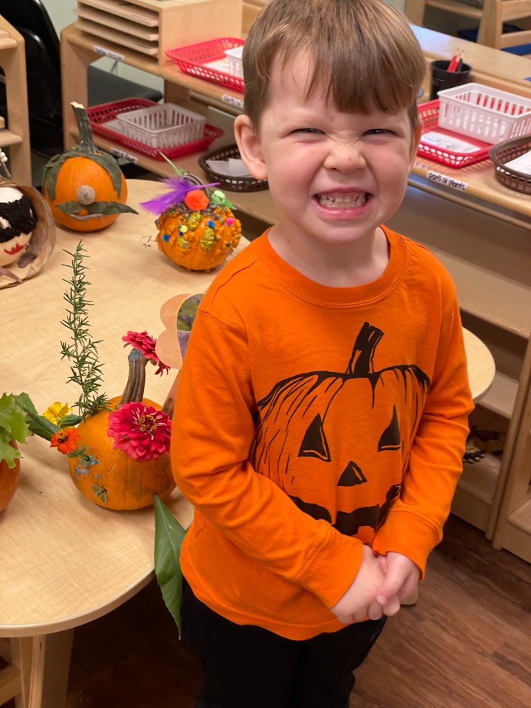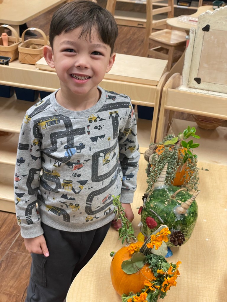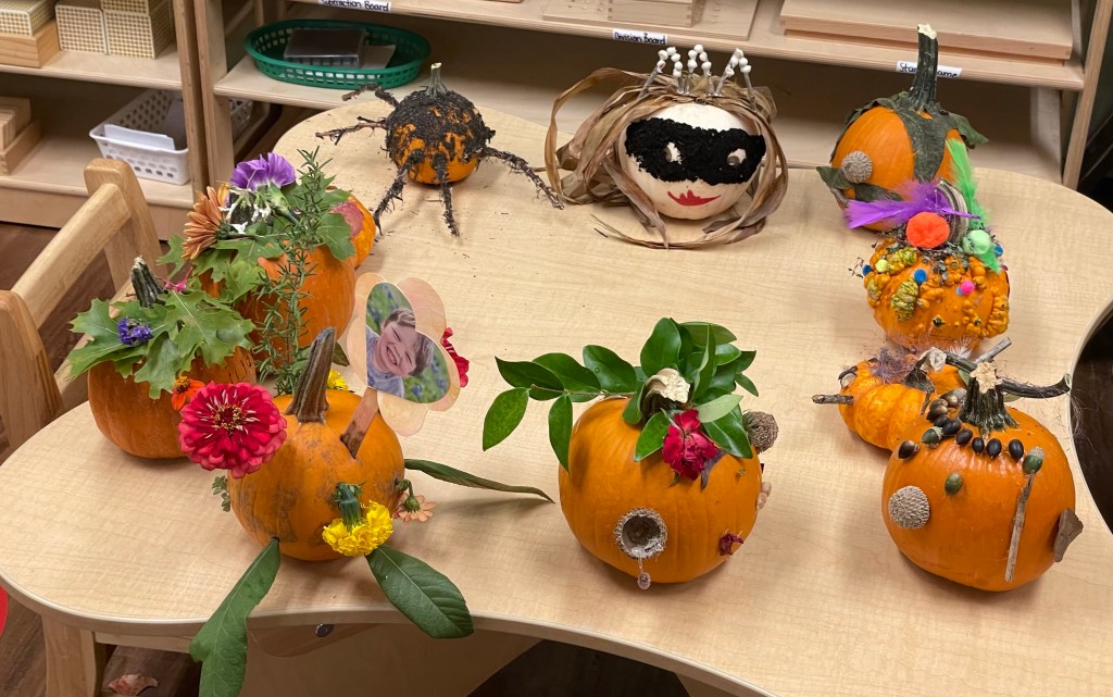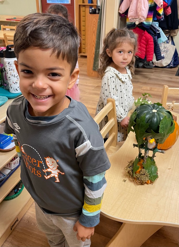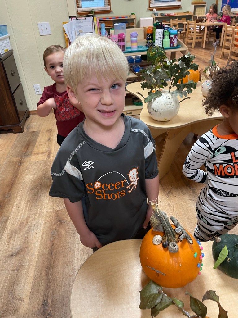 The pumpkins are creative and wonderful! All the children will show off their pumpkins during circle time and a few wanted to pose with their friends and their pumpkins for the blog!