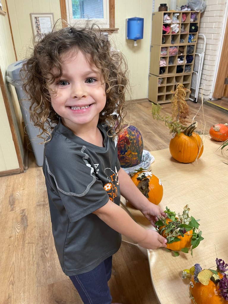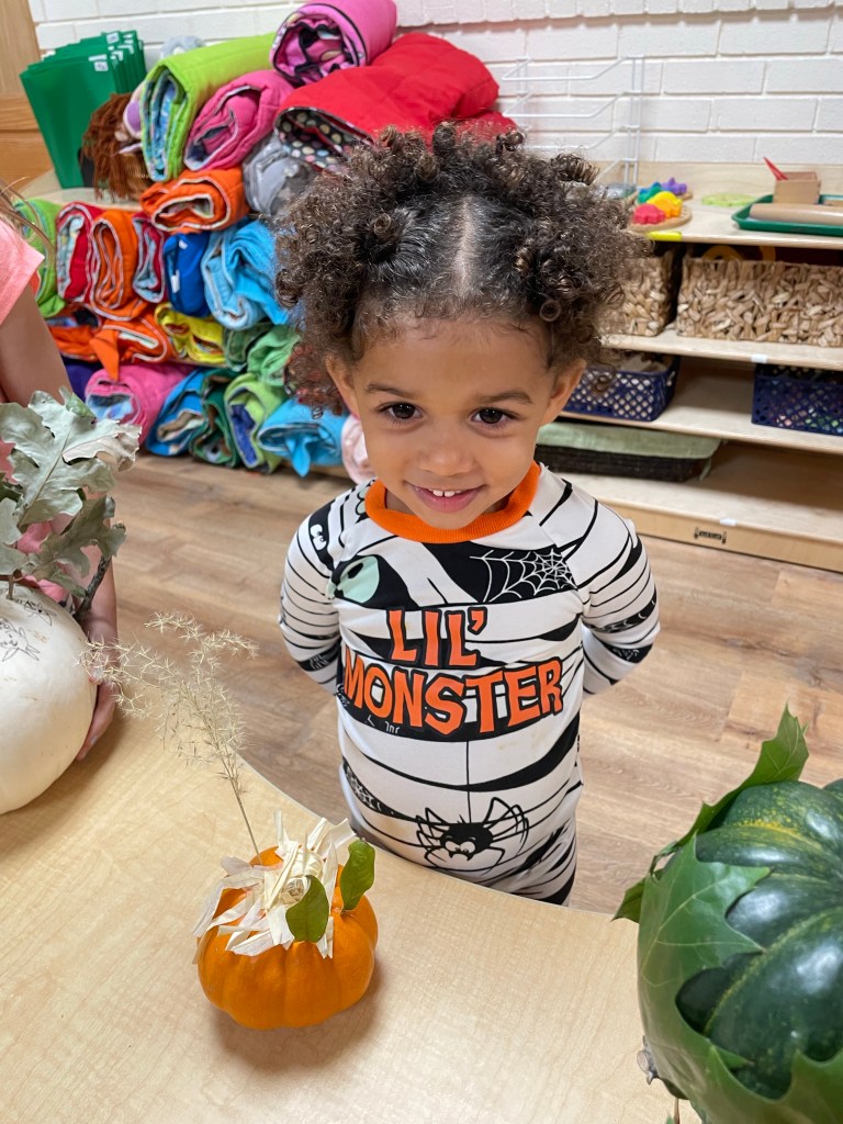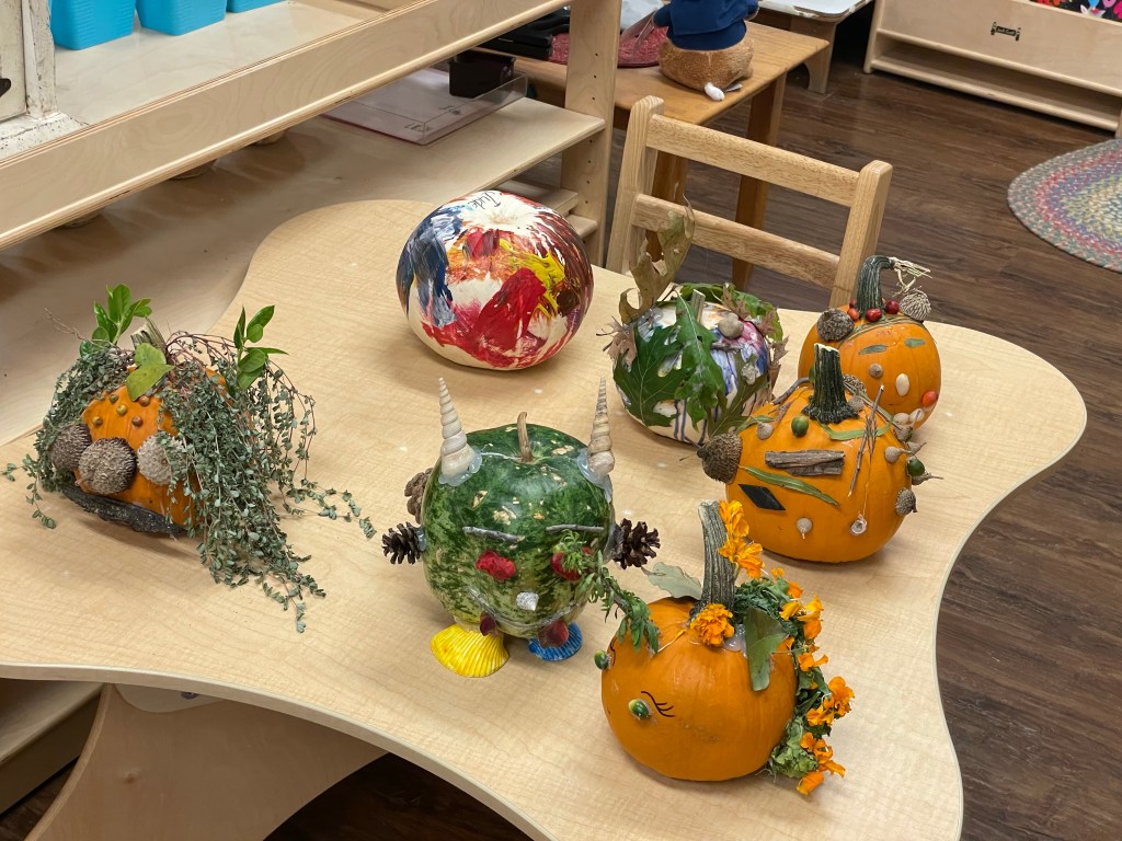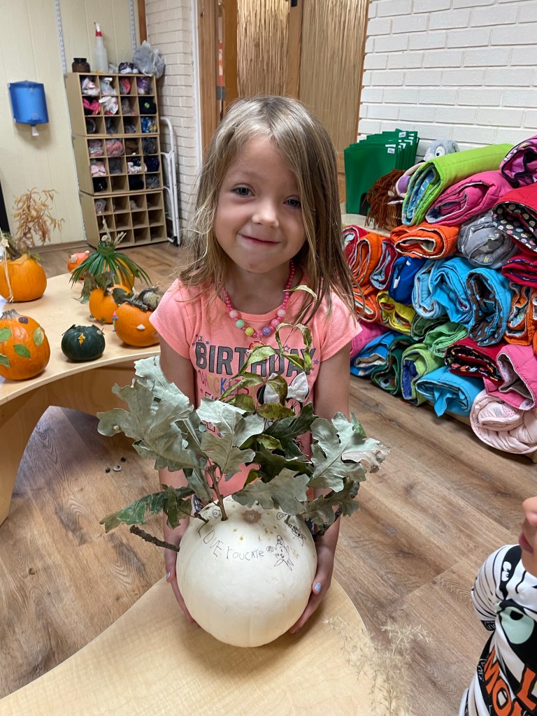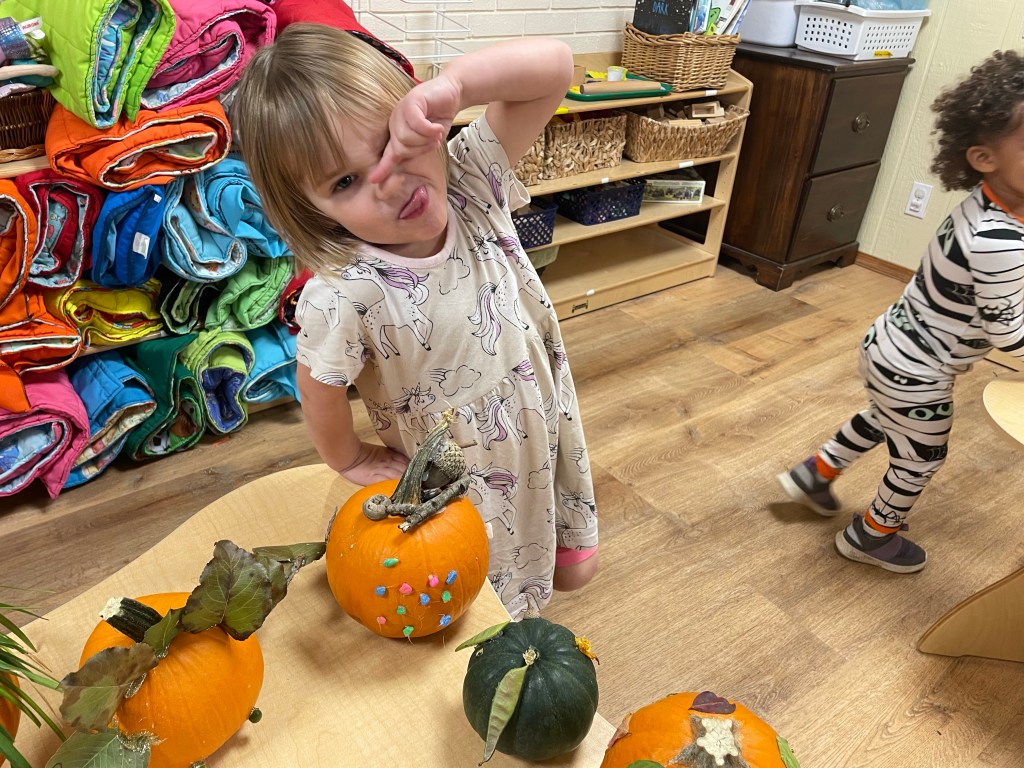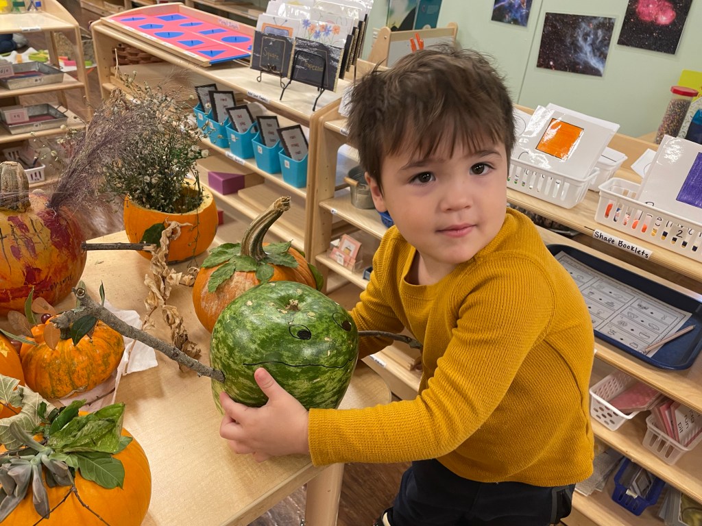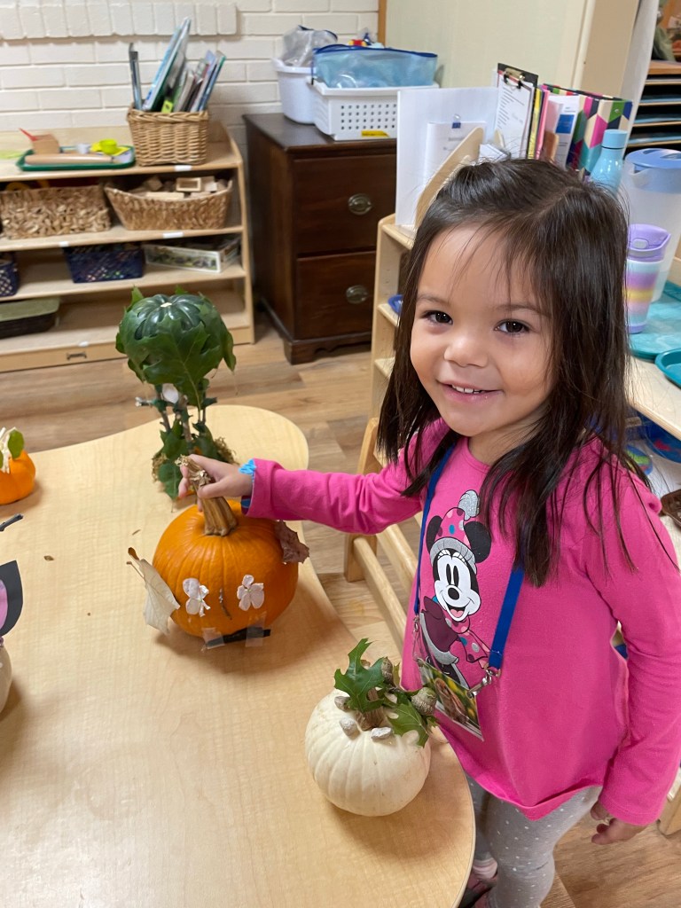 The pumpkins are creative and wonderful! All the children will show off their pumpkins during circle time and a few wanted to pose with their friends and their pumpkins for the blog!