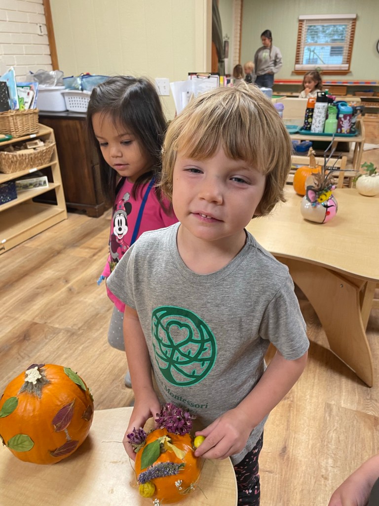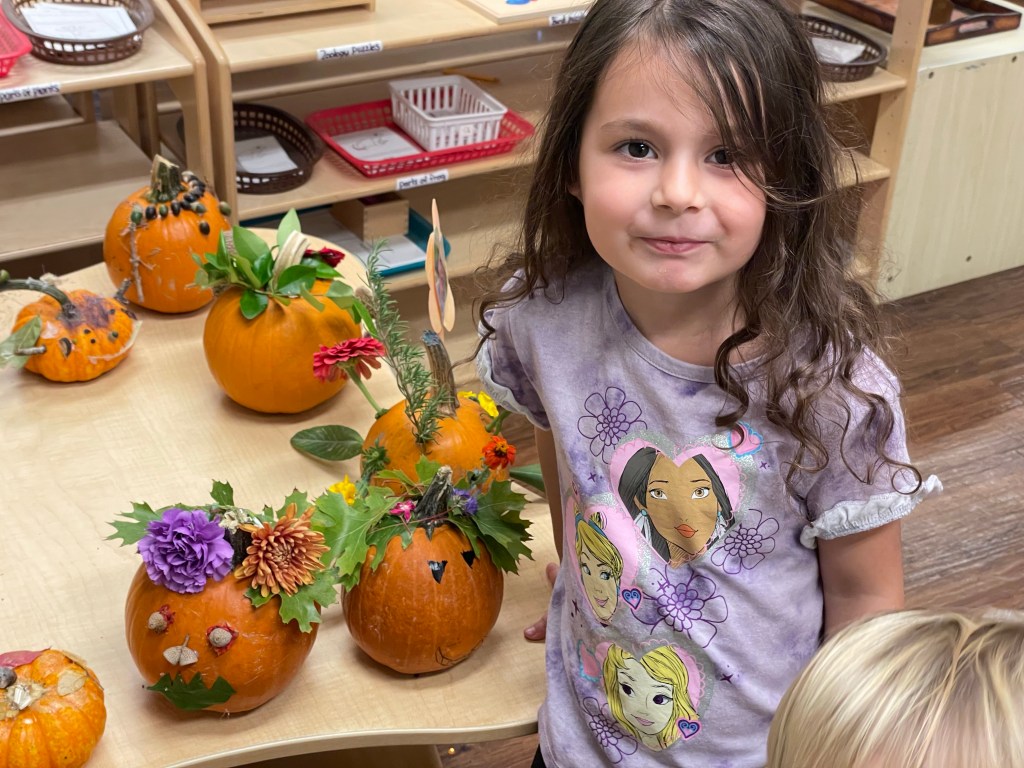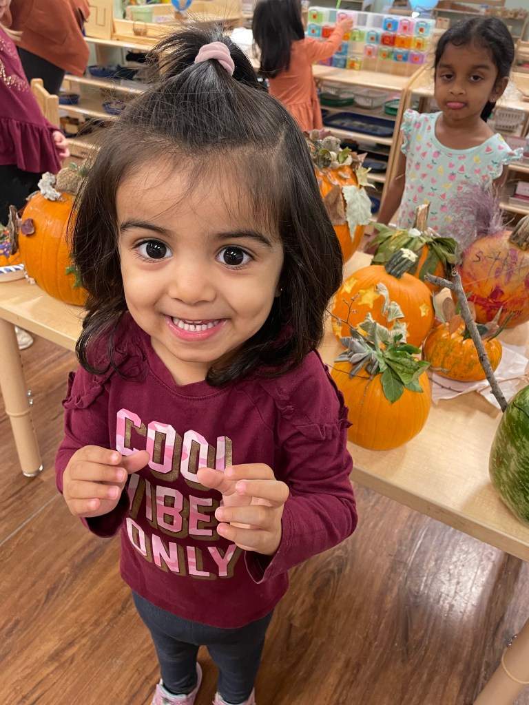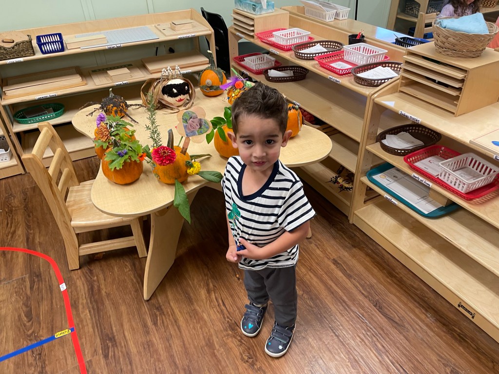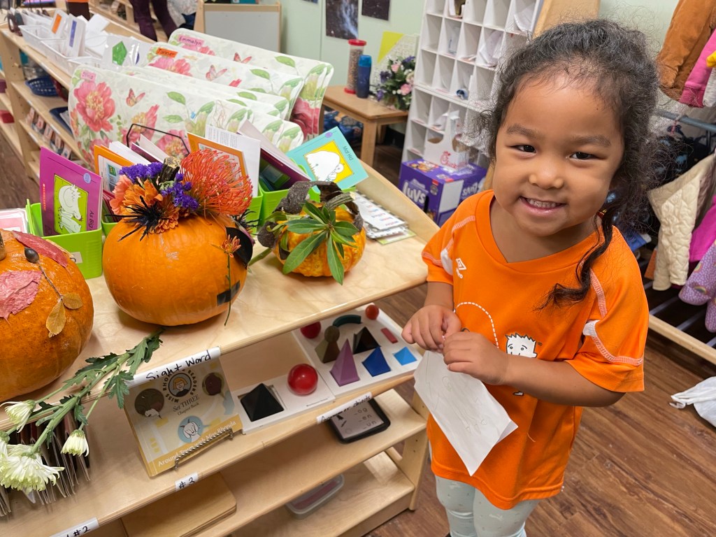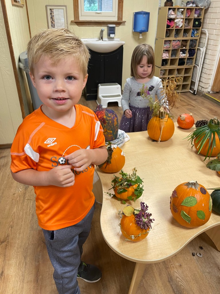 The pumpkins are creative and wonderful! All the children will show off their pumpkins during circle time and a few wanted to pose with their friends and their pumpkins for the blog!