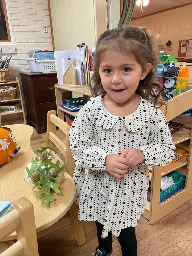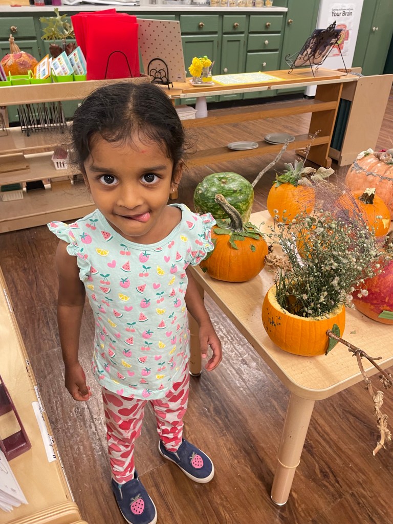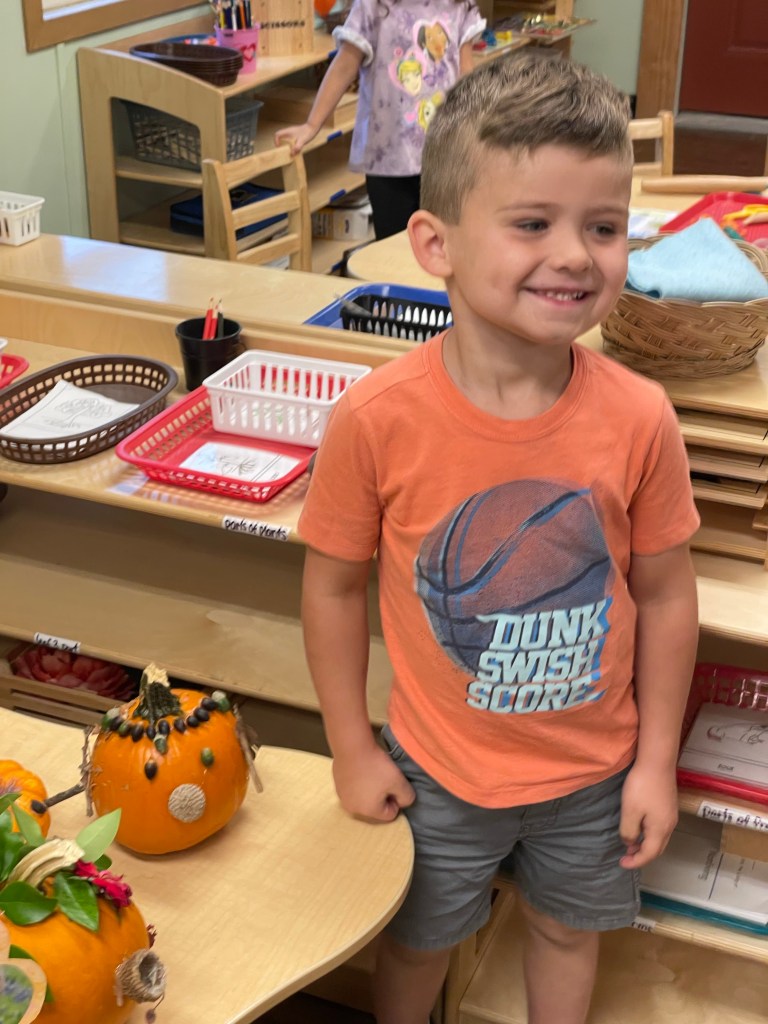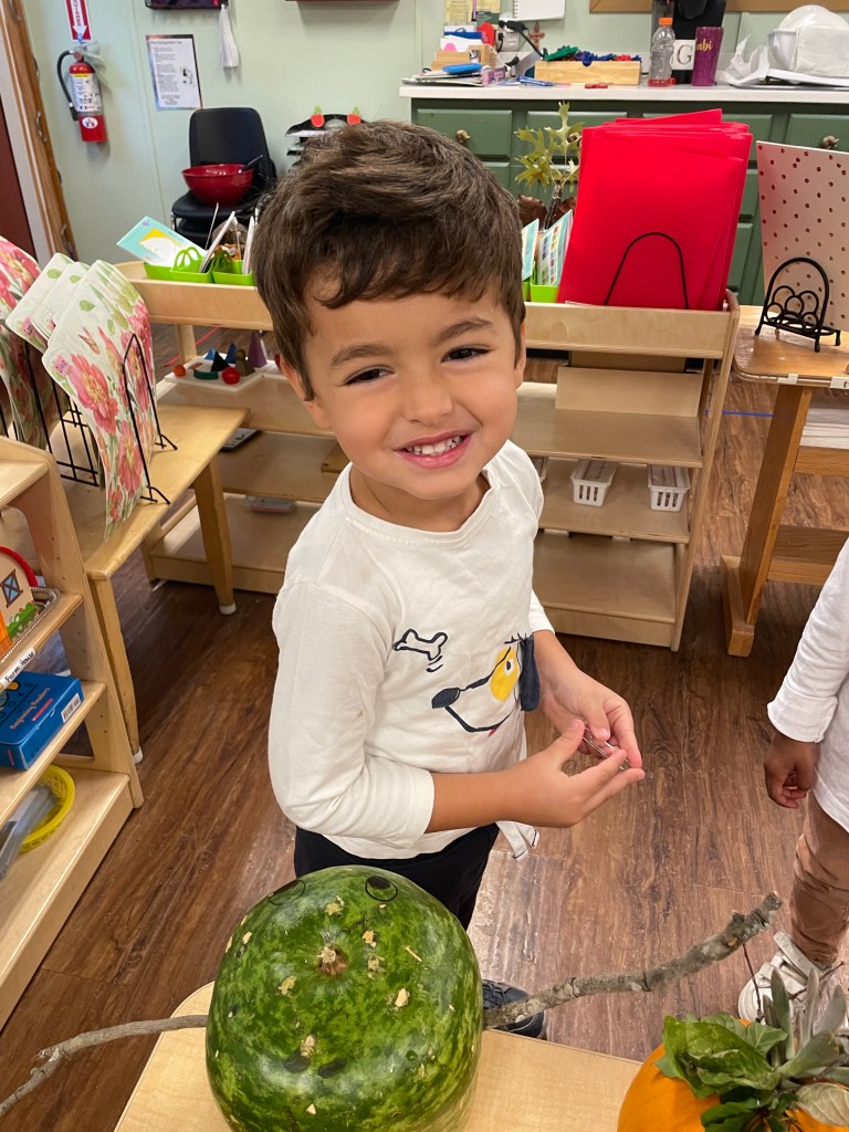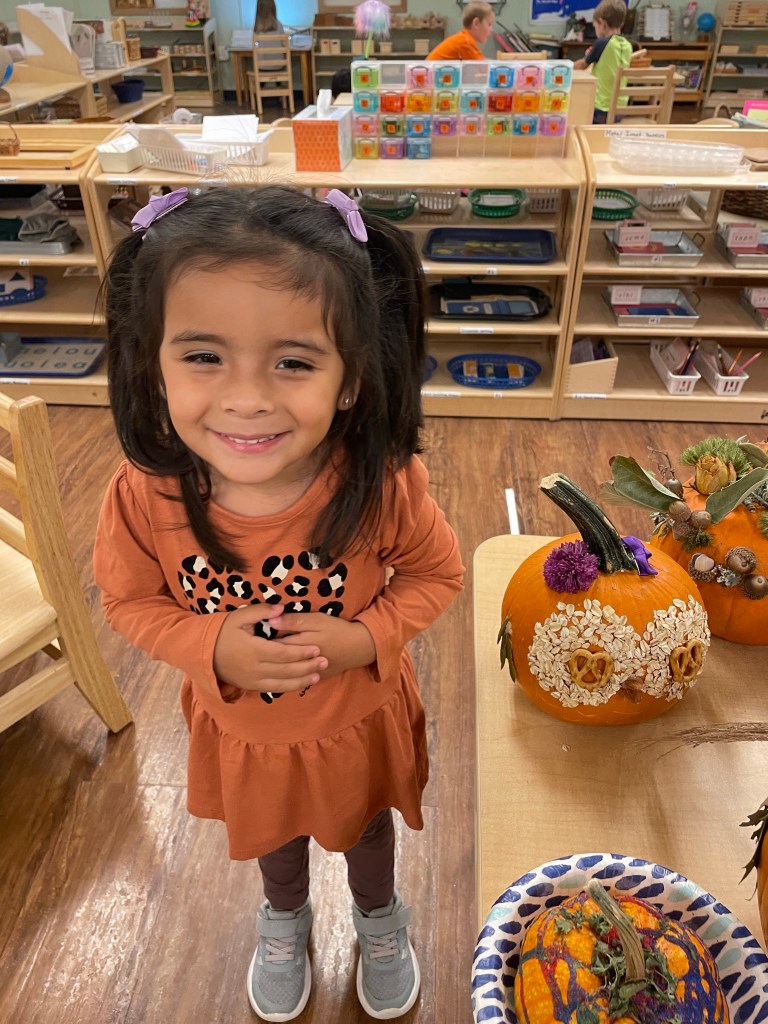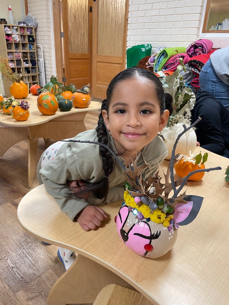 The pumpkins are creative and wonderful! All the children will show off their pumpkins during circle time and a few wanted to pose with their friends and their pumpkins for the blog!