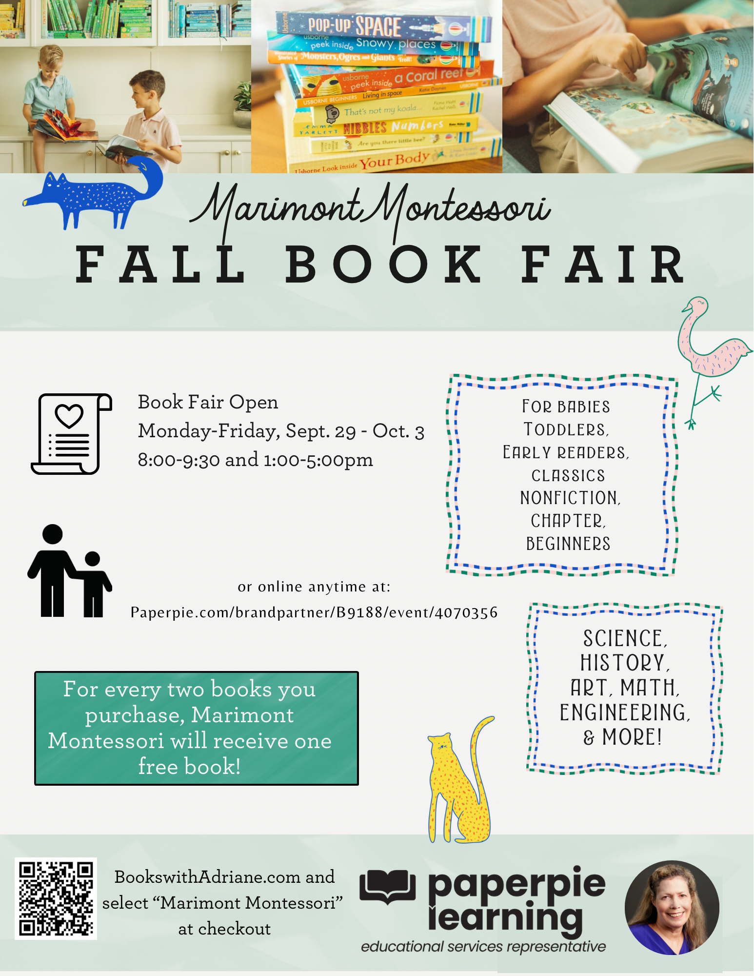 Here is where you can place online BOOK FAIR orders to have shipped to your home if you’d like! Please choose “Marimont Montessori Preschool” at checkout. Text any questions to: Adriane Kristo-Reinking at 310-433-0773 or email at adrikri777@gmail.com